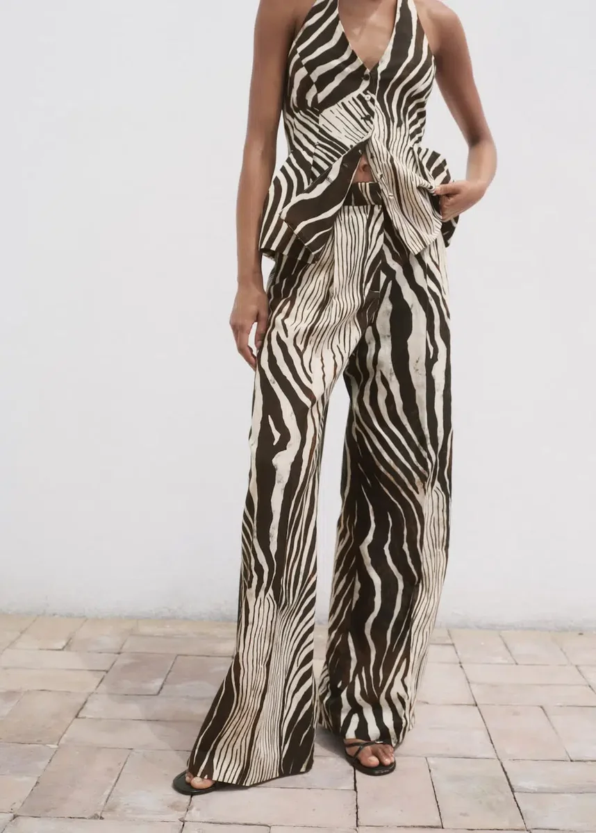 Tessuto misto lino e cotone. Modello lungo. Gamba larga. Stampa zebrata. Vita media. Passanti per cintura. Due tasche laterali. Chiusura con bottone, gancio e zip nascosti. Fodera 100% cotone. Total look
