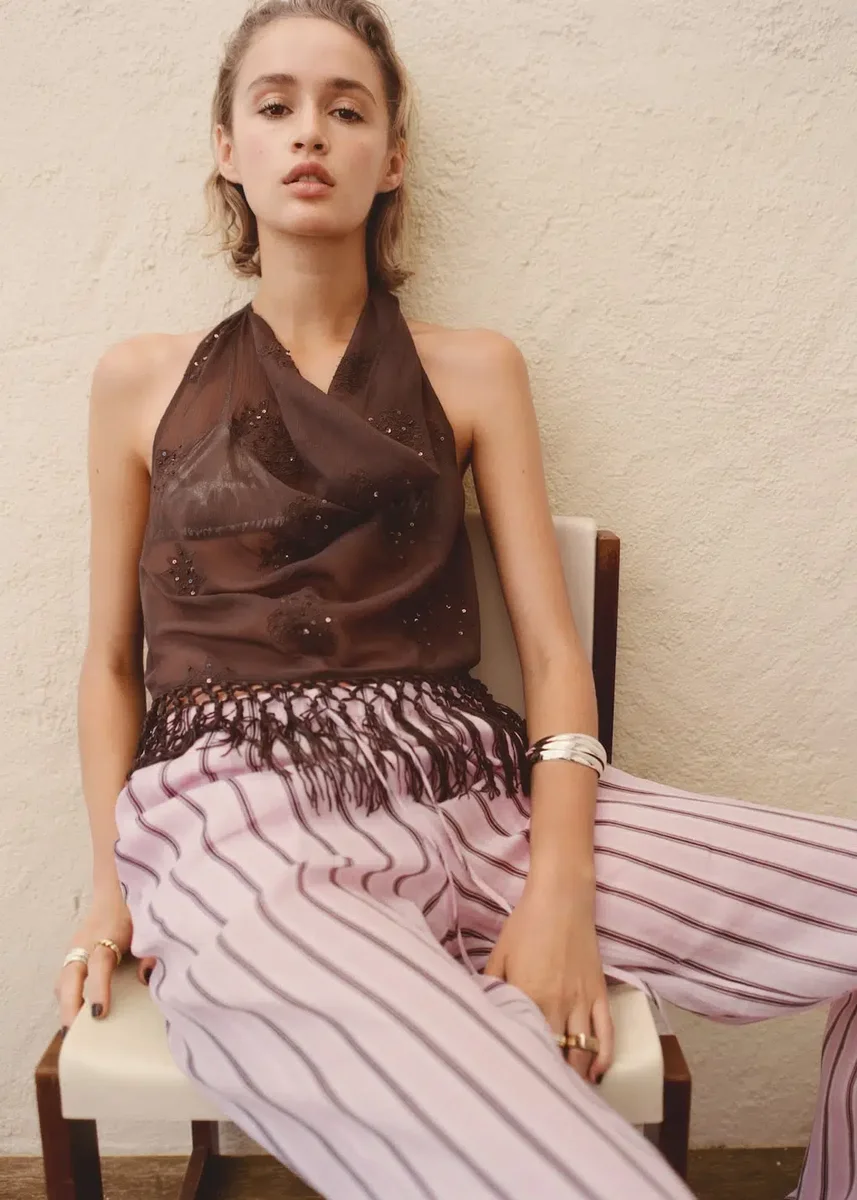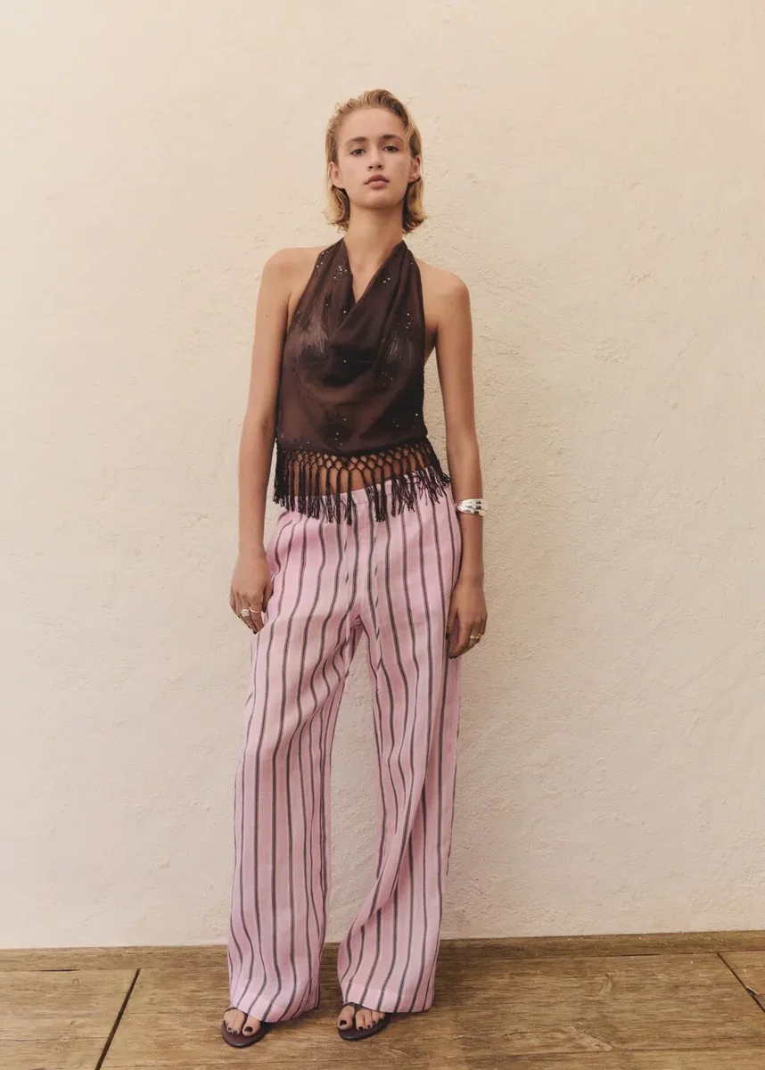 Tessuto 100% ramiè. Modello lungo. Modello dritto. Modello a righe. Vita media. Stringa in vita. Total look.