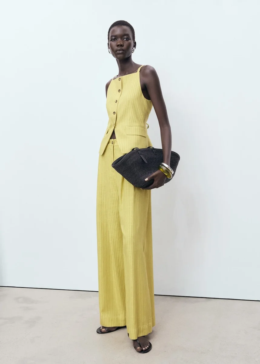 Tessuto misto lino e lyocell. Modello lungo. Modello dritto. Modello a righe. Vita alta. Dettaglio pinces. Due tasche laterali. Chiusura con bottoni e cerniera. Total look
