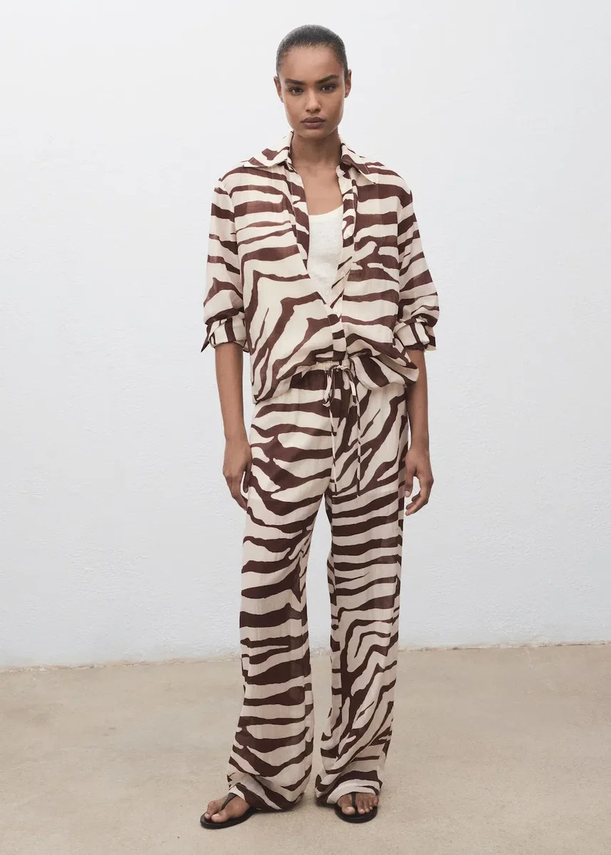 Tessuto fluido. Modello lungo. Modello dritto. Stampa zebrata. Vita media. Elastico in vita con coulisse. Senza chiusura. Fodera 100% cotone. Total look