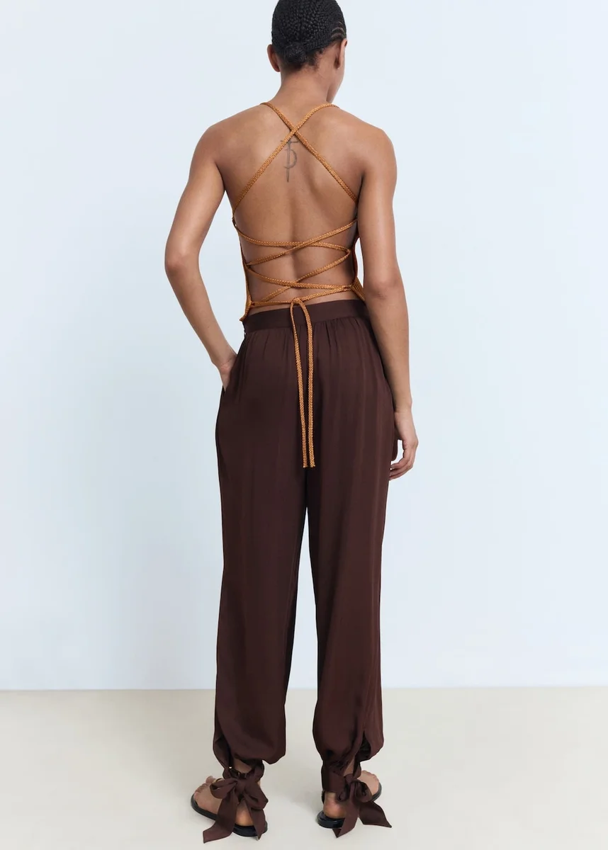 Tessuto elasticizzato. Orlo a palloncino. Due tasche laterali. Orlo a palloncino. Dettaglio fiocco sull’orlo. Senza chiusura.