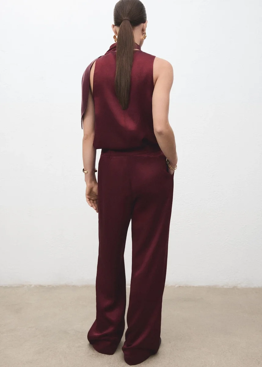 Tessuto in raso. Modello lungo. Gamba larga. Vita media. Passanti per cintura. Dettaglio piega frontale. Due tasche laterali. Chiusura con bottone nascosto, gancio e zip. Fodera interna. Total look.