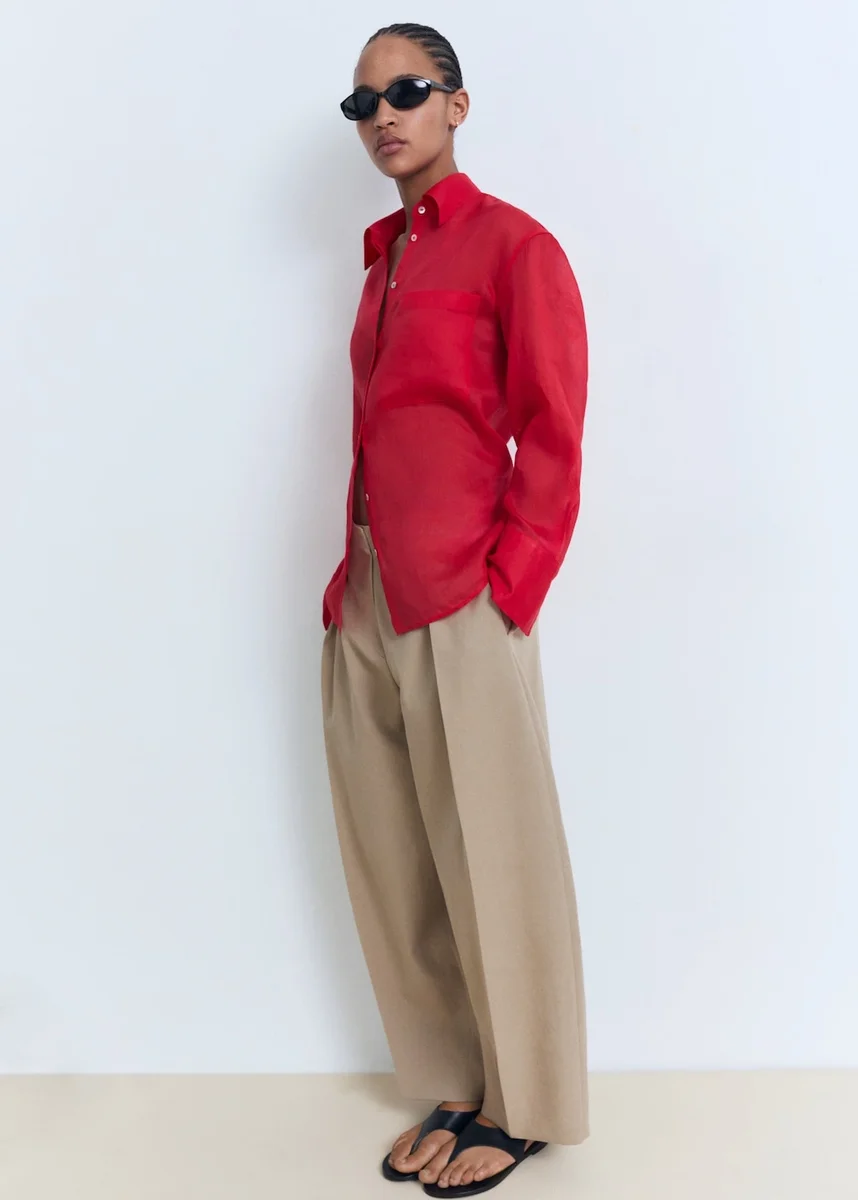 Tessuto misto cotone e lino. Modello pantalone. Design a palloncino. Vita media. Dettaglio pinces. Due tasche laterali. Due tasche a filetto sul retro. Chiusura con bottone nascosto, gancio e zip. Fodera 100% cotone. Total look. Il colore rosso è un’esclusiva online.