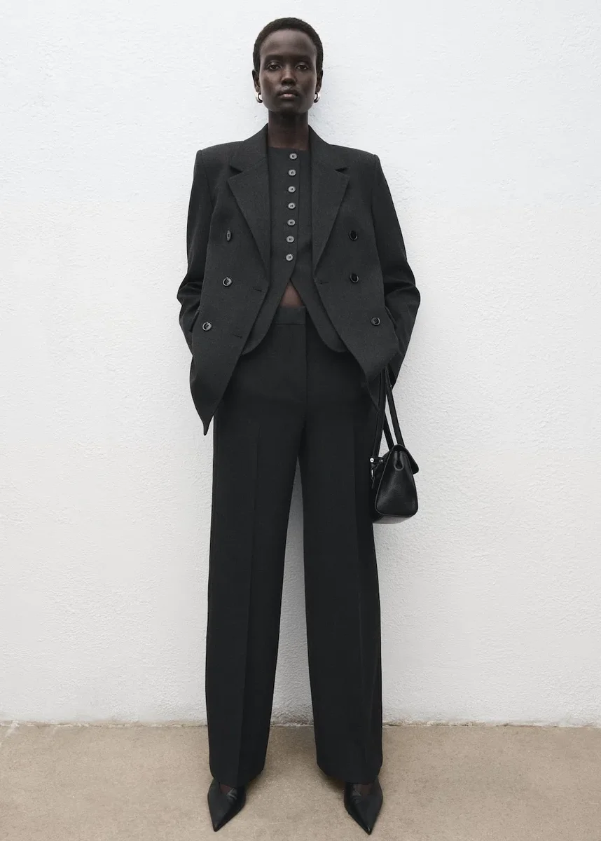 Stile pantalone da completo. Modello lungo. Modello dritto. Vita media. Due tasche laterali. Chiusura con zip, bottone e gancio e asola nascosti con abbottonatura. Fodera interna. Total look.