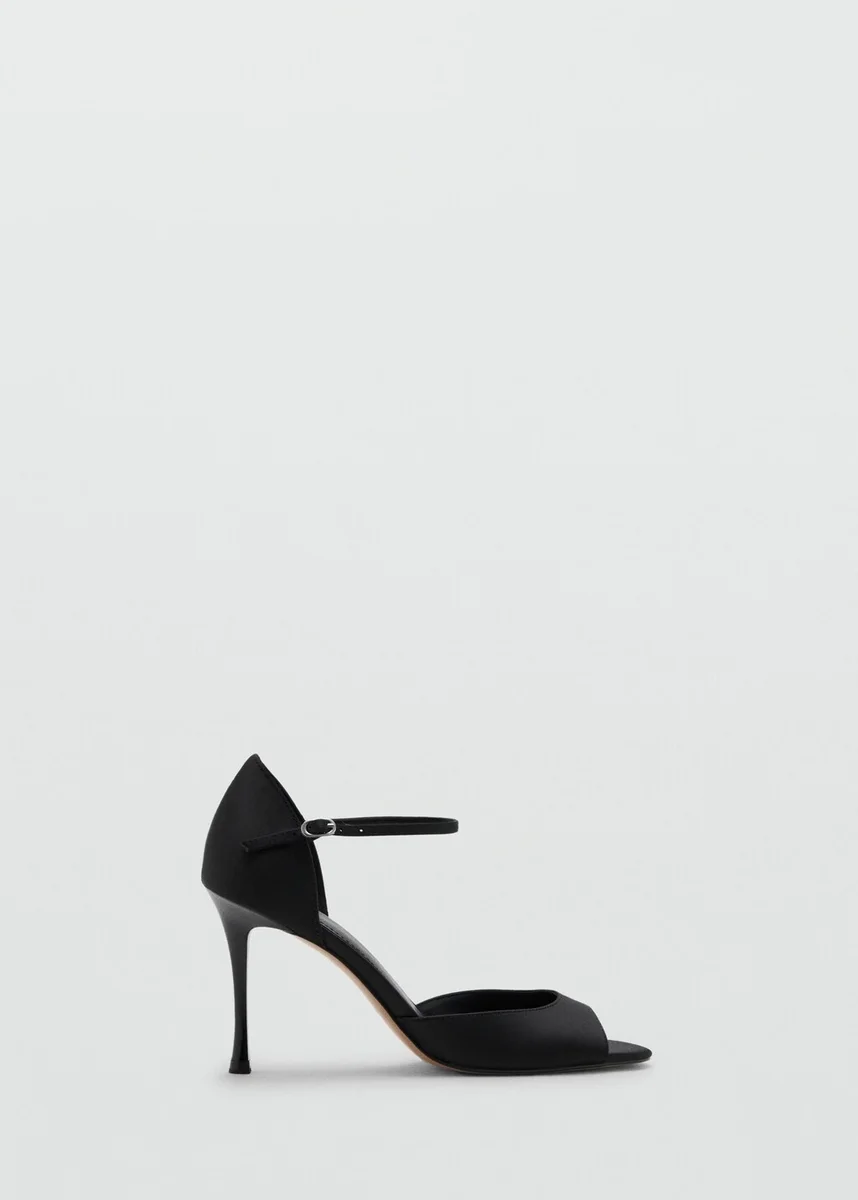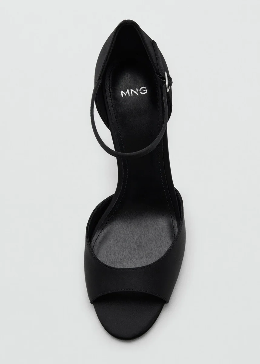 Tessuto satinato. Design con cinturino. Punta aperta. Tacco a spillo. Chiusura con cinturino alla caviglia con fibbia in metallo. Tacco 3,54 pollici
