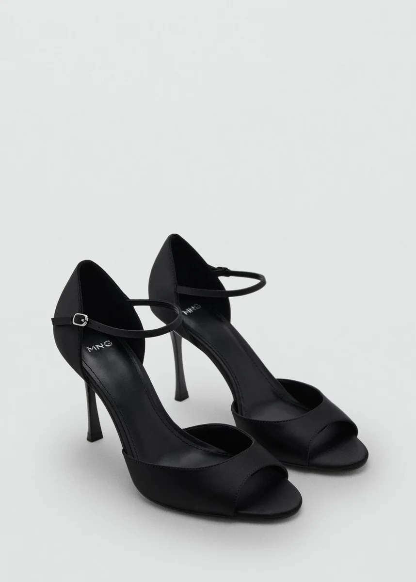 Tessuto satinato. Design con cinturino. Punta aperta. Tacco a spillo. Chiusura con cinturino alla caviglia con fibbia in metallo. Tacco da 3,54 pollici
