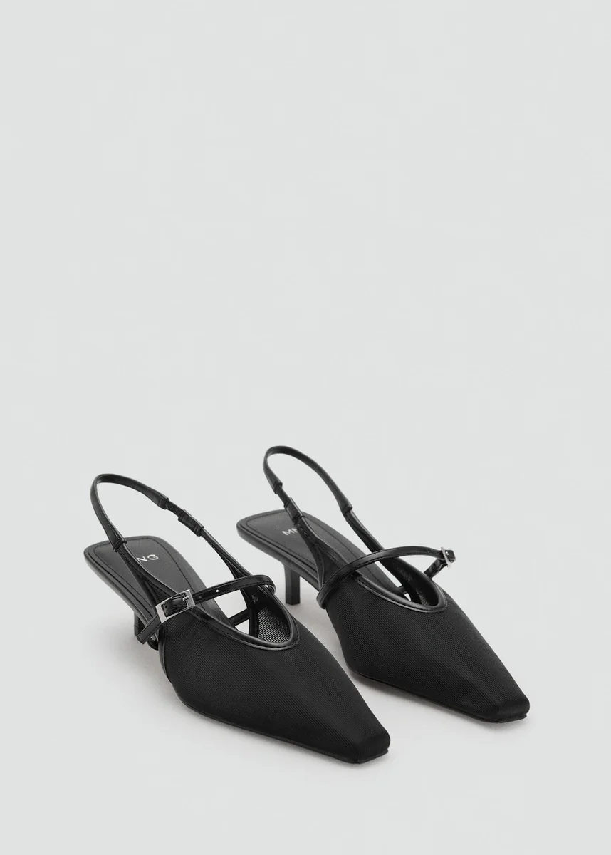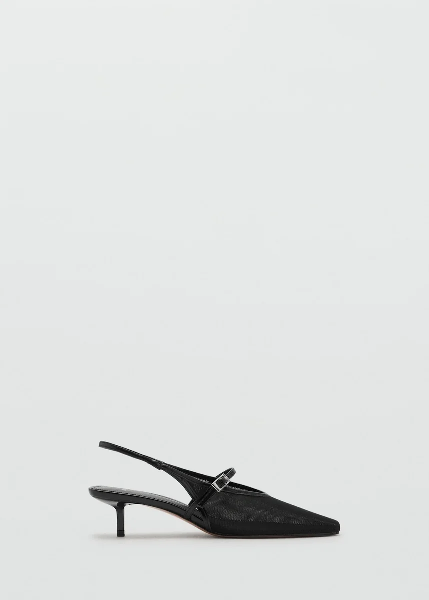 Modello con cinturino posteriore. Punta affusolata. Fibbia regolabile. Tacco basso. Tacco 4,5 cm. Fodera interna. Prodotto promozionale