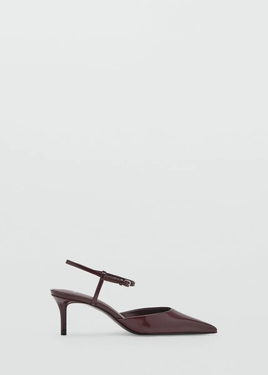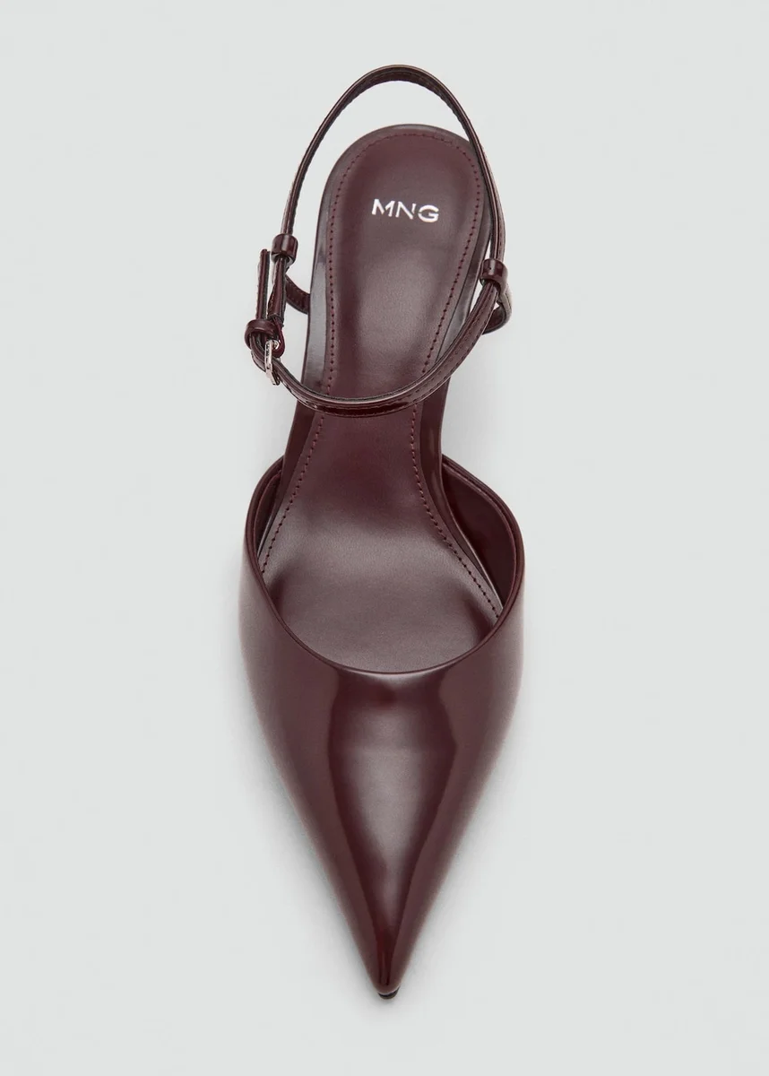 Effetto vernice. Punta affusolata. Cinturino alla caviglia. Tacco basso. Chiusura con fibbia alla caviglia. Tacco 7 cm.