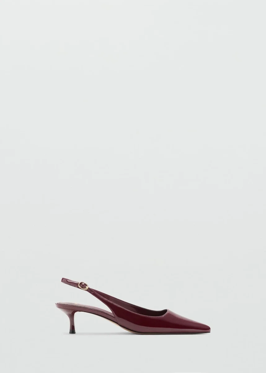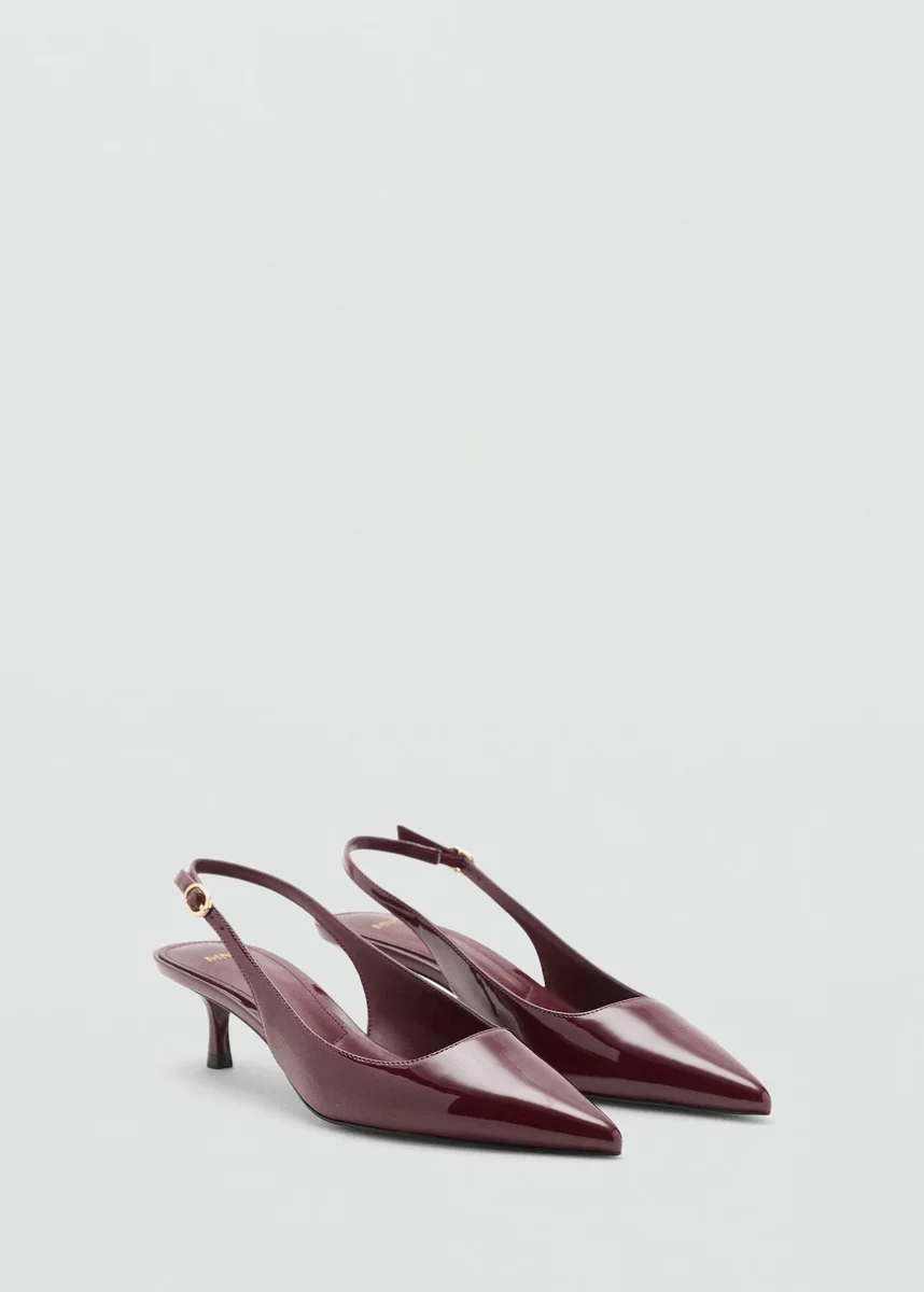 Effetto verniciato. Design slingback. Punta affusolata. Tacco basso. 5 cm. Chiusura con fibbia alla caviglia