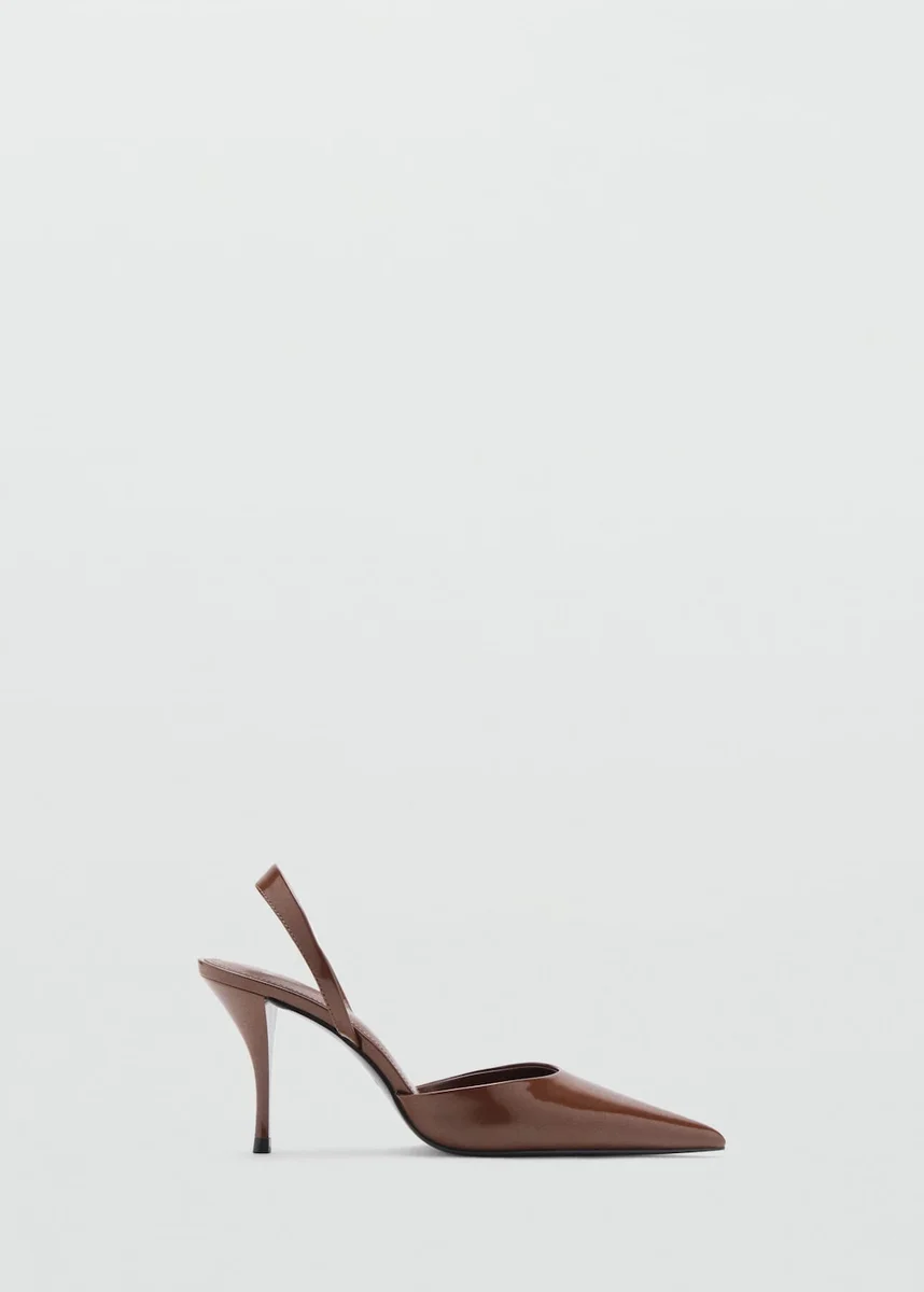 Effetto vernice. Punta affusolata. Tacco a spillo. Design con cinturino posteriore.
