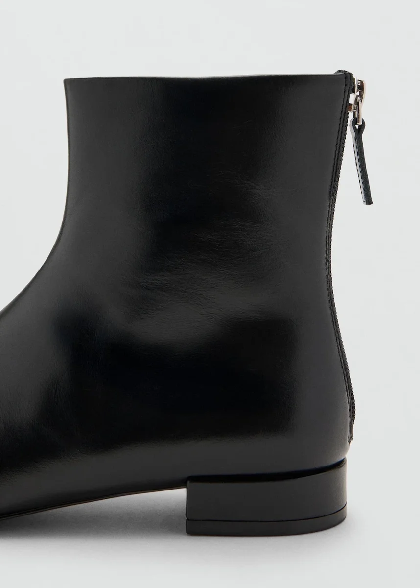 Pelle bovina. Punta arrotondata. Chiusura con cerniera sul retro. Fodera interna in pelle