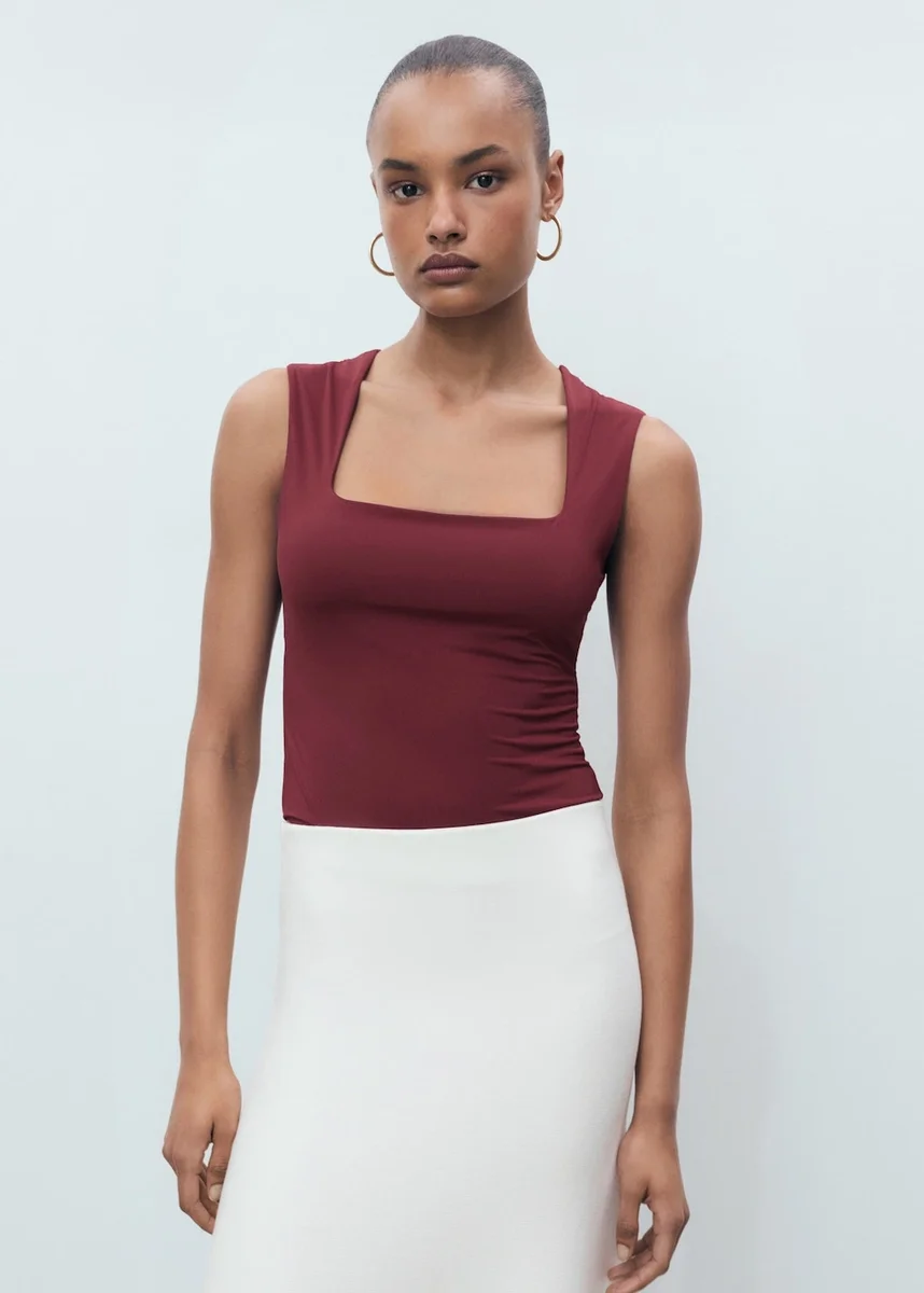 Questo modello aderente con spalline larghe offre una silhouette semplice e confortevole. Abbinalo a dei jeans per un look casual o a dei pantaloni sartoriali per un outfit più adatto all’ufficio