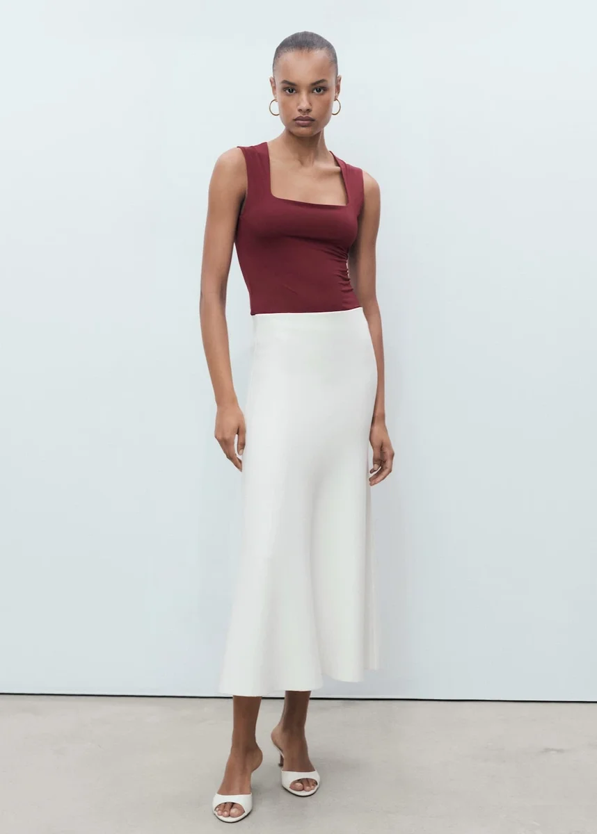 Questo modello aderente con spalline larghe offre una silhouette semplice e confortevole. Abbinalo a un paio di jeans per un look casual o a pantaloni sartoriali per un outfit più adatto all’ufficio.