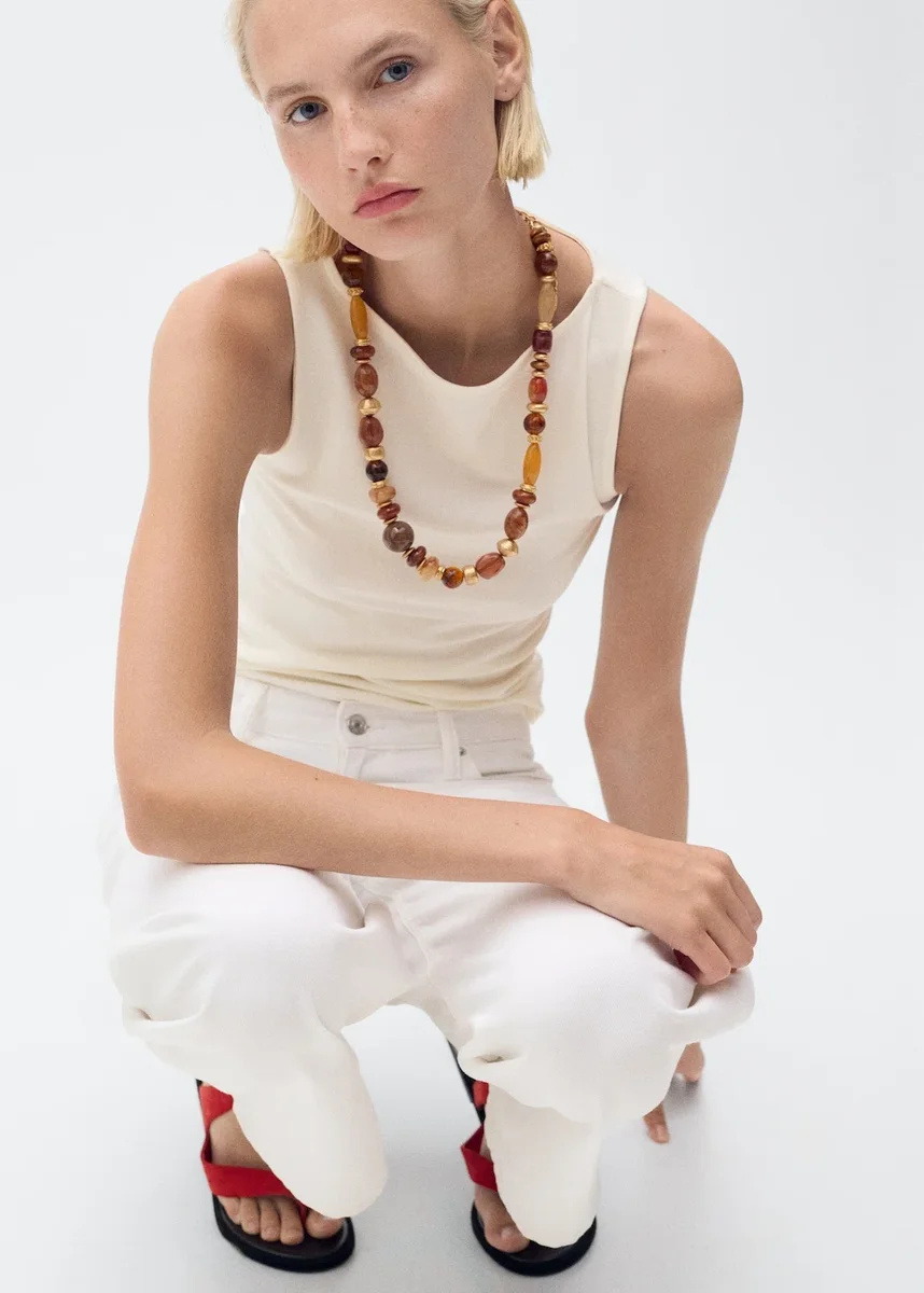 Realizzato in tessuto di cotone, questo modello sartoriale presenta uno scollo a barchetta con spalline larghe, che offrono comfort