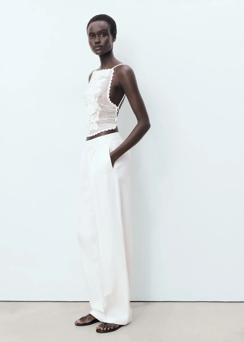 Realizzato in tessuto all’uncinetto, questo modello aderente senza maniche presenta spalline sottili e una schiena scoperta con chiusura a fiocco, per uno stile unico e sofisticato.
