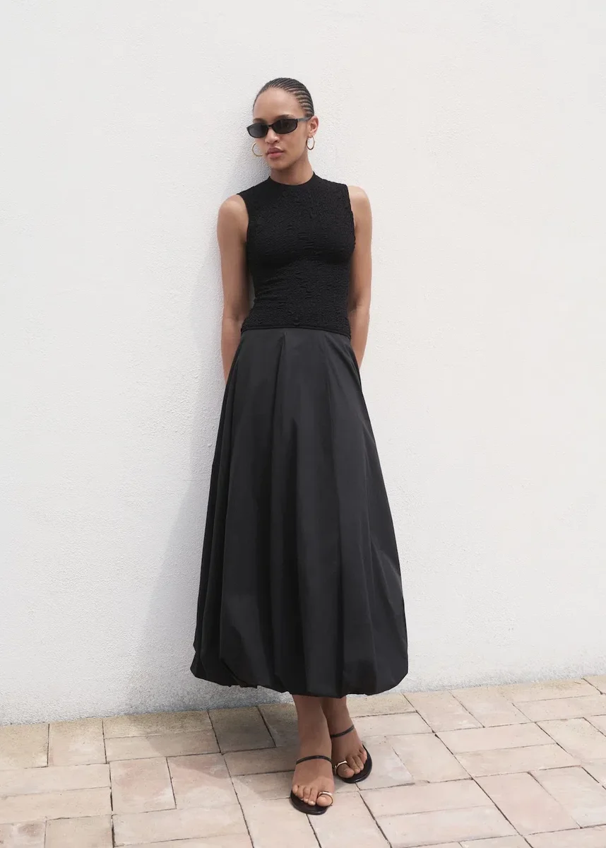 Realizzato in tessuto crêpe, questo modello sartoriale presenta scollo rotondo e spalline larghe