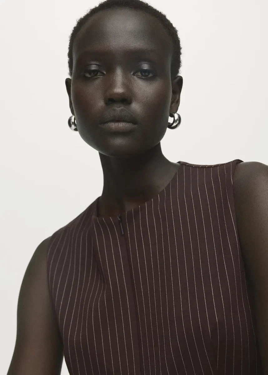 Con un design aderente, questo top presenta una scollatura rotonda e spalline larghe. La chiusura frontale con cerniera completa il look, conferendogli un aspetto contemporaneo. È abbinato a pantaloni coordinati