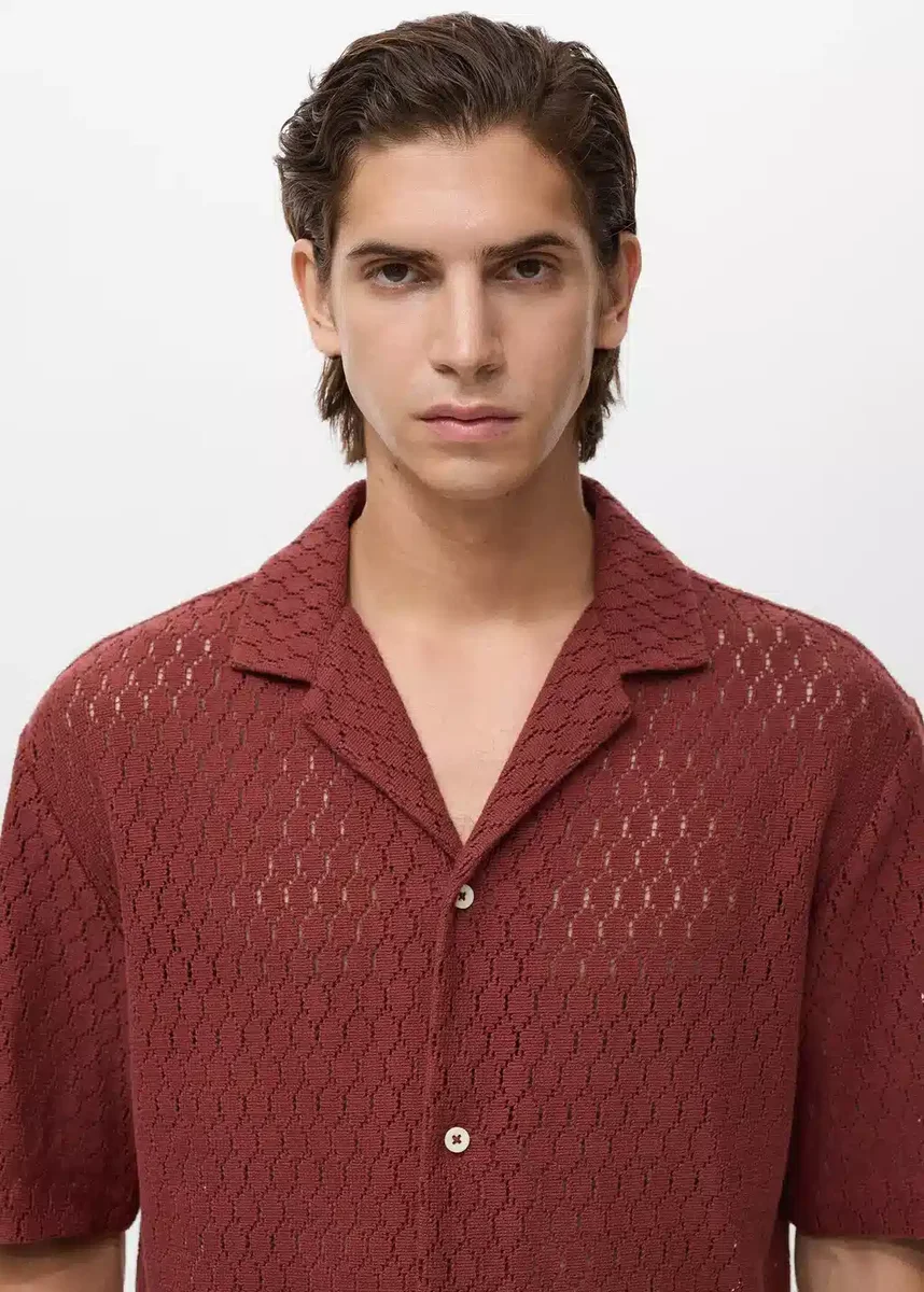 Tessuto 100% cotone. Silhouette regolare. Maglia traforata. Colletto bowling. Maniche corte. Chiusura frontale con bottoni. Orlo dritto. Piccoli spacchi laterali sull’orlo
