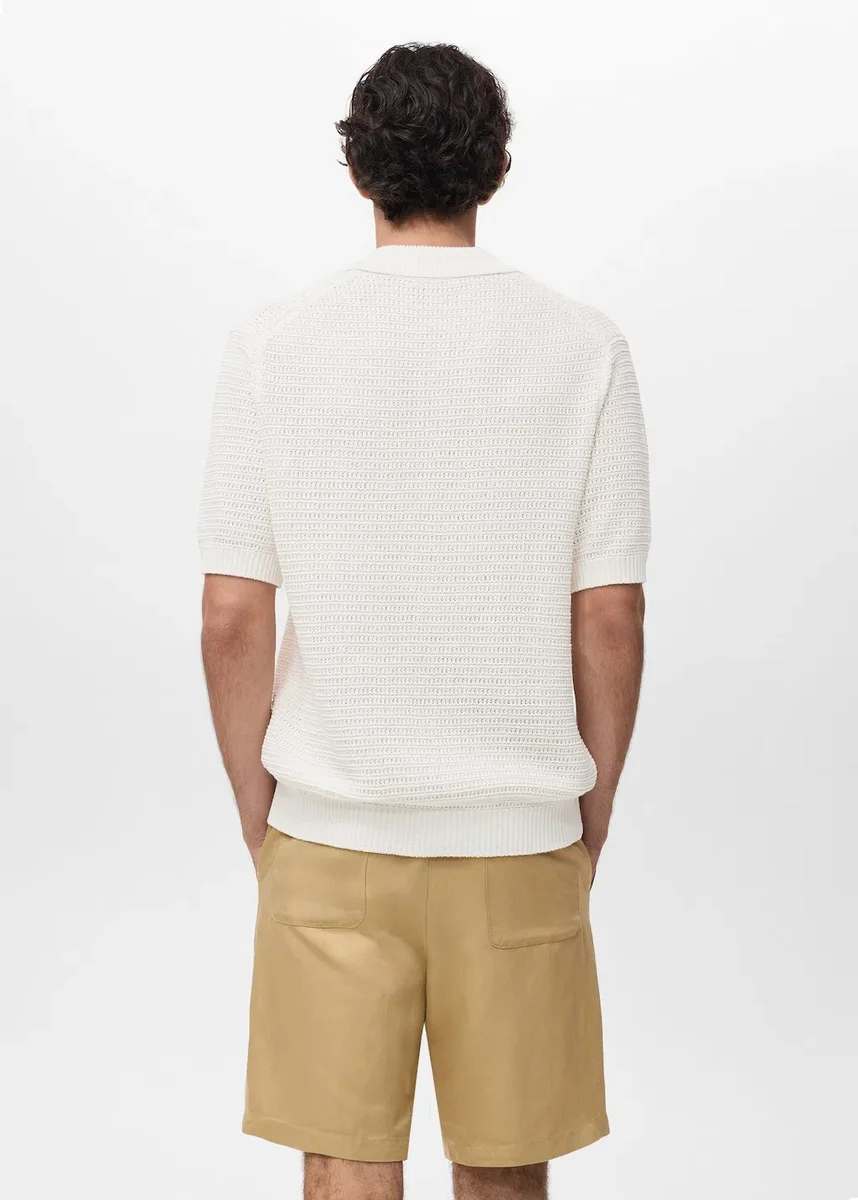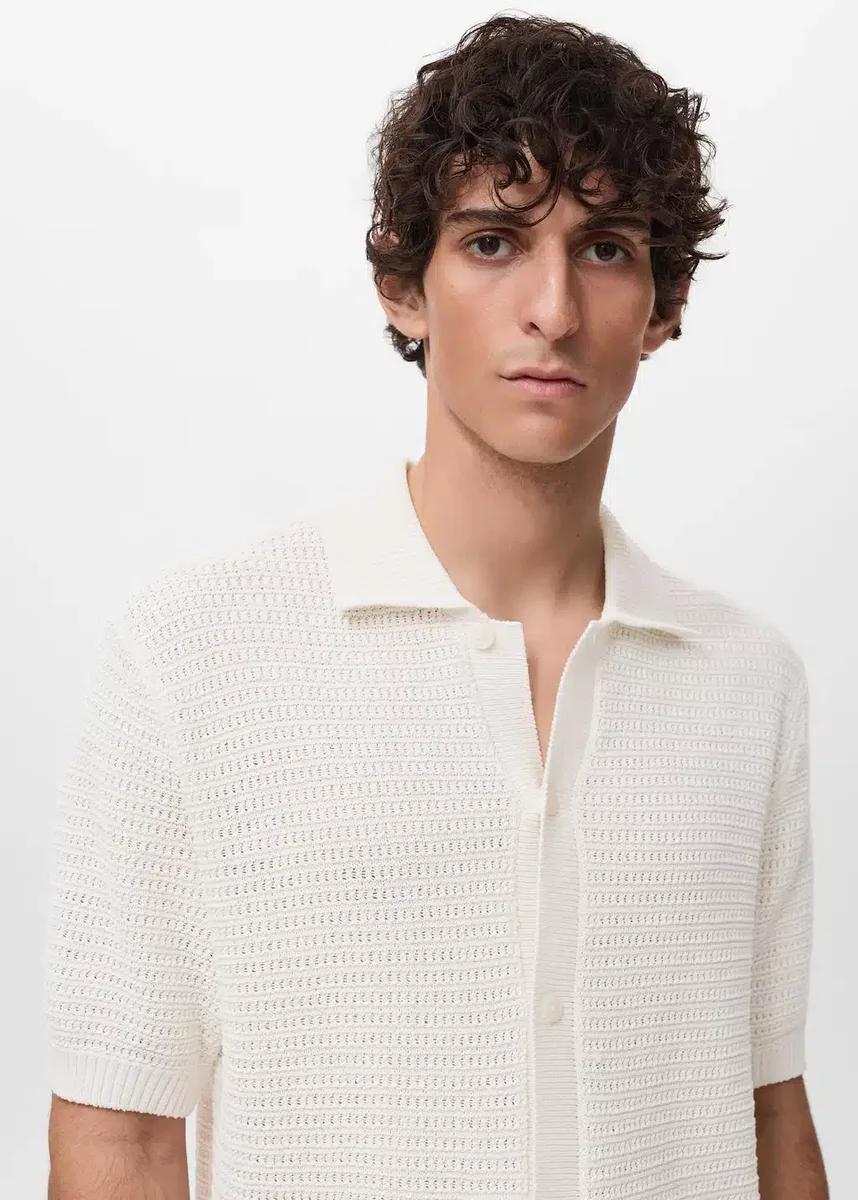 Vestibilità regolare. Tessuto misto cotone. Tessuto a maglia fine con dettagli a strisce traforate. Chiusura con bottoni sul davanti. Finiture a costine su colletto, maniche, abbottonatura e orlo. Orlo dritto. Prodotto in promozione.