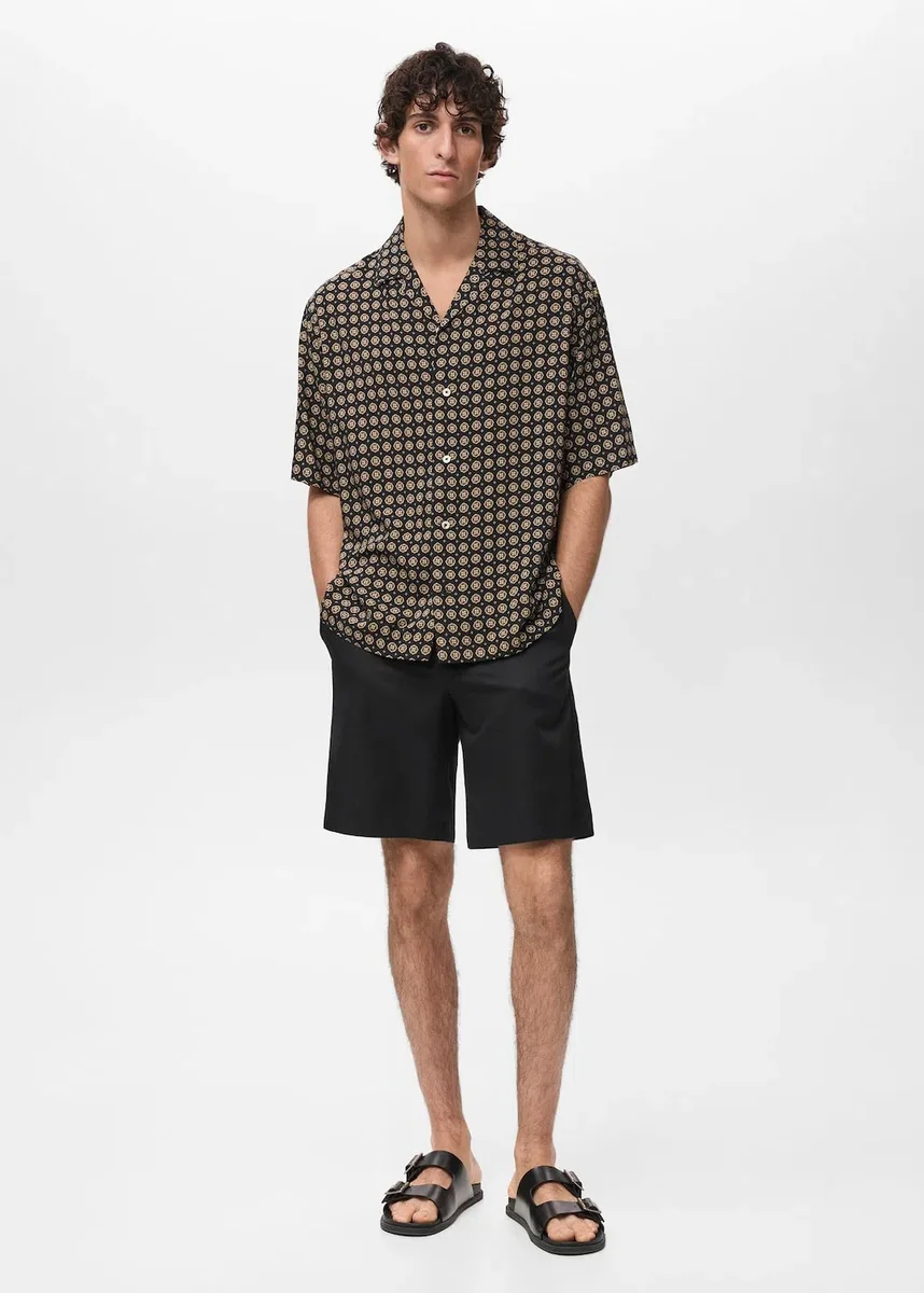 100% viscosa. Vestibilità regolare. Tessuto fluido. Collo alla coreana. Chiusura con bottoni sul davanti. Maniche corte. Orlo dritto.