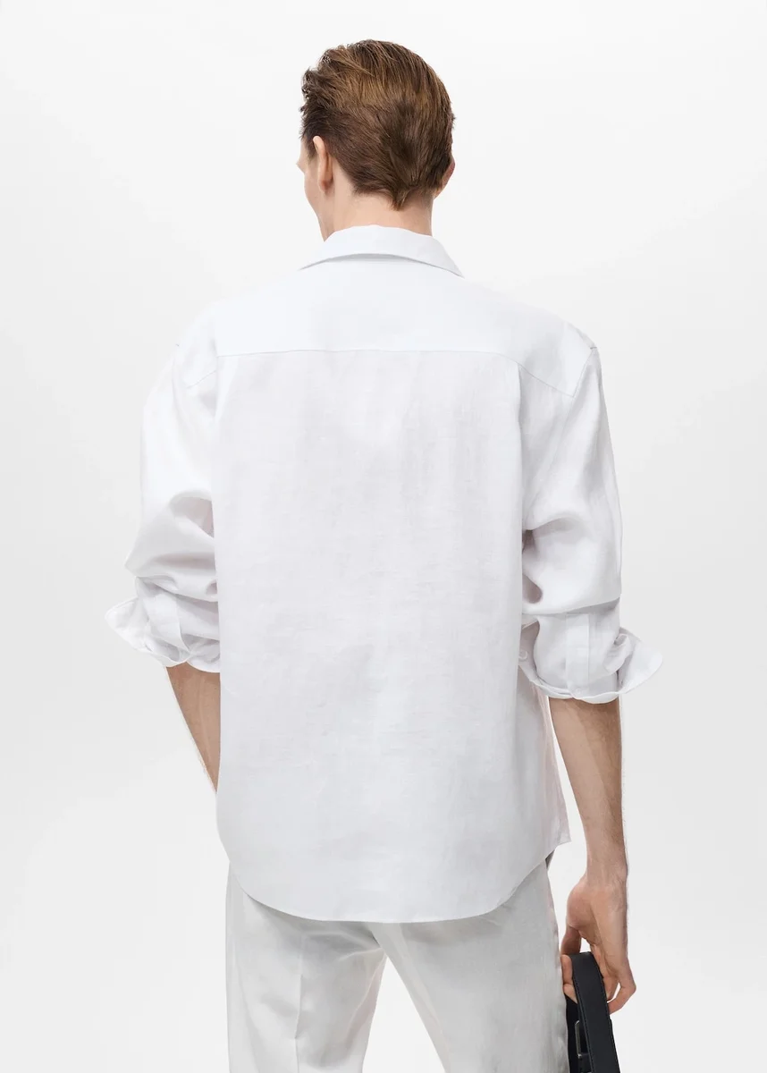 Silhouette rilassata. Tessuto 100% lino. Colletto camicia. Chiusura frontale con bottoni. Tasca applicata sul petto. Maniche lunghe. Polsini con bottoni. Orlo arrotondato. Dettaglio pinces sul retro.