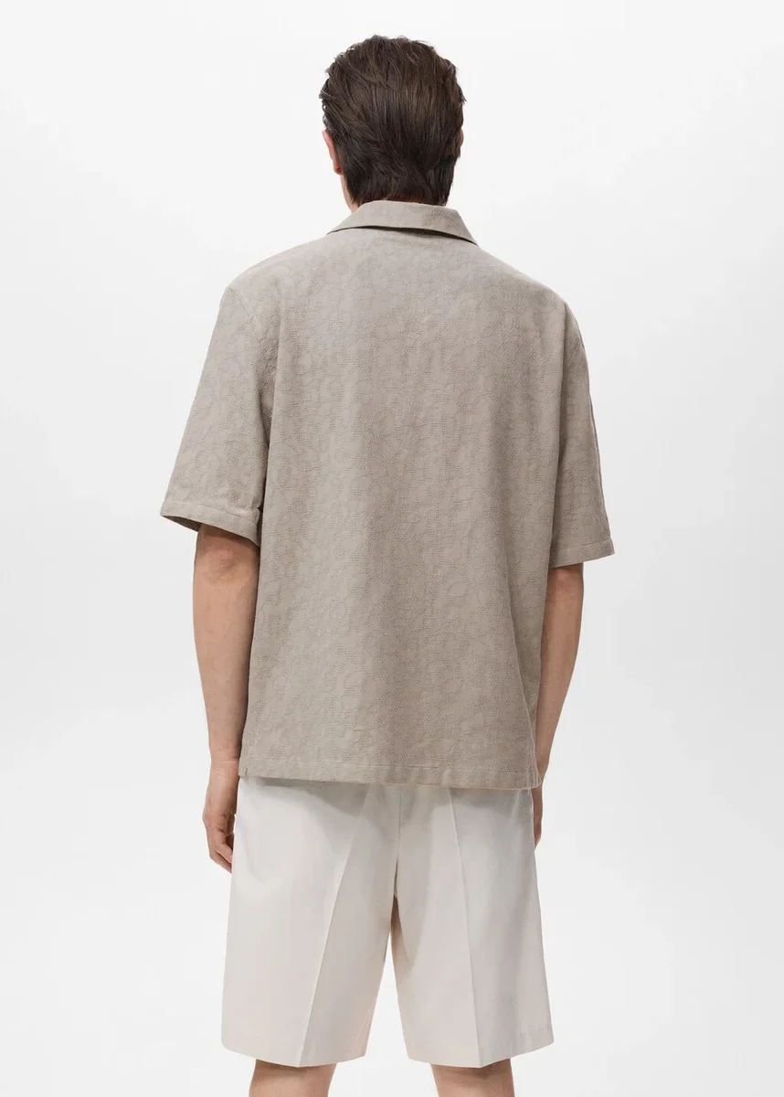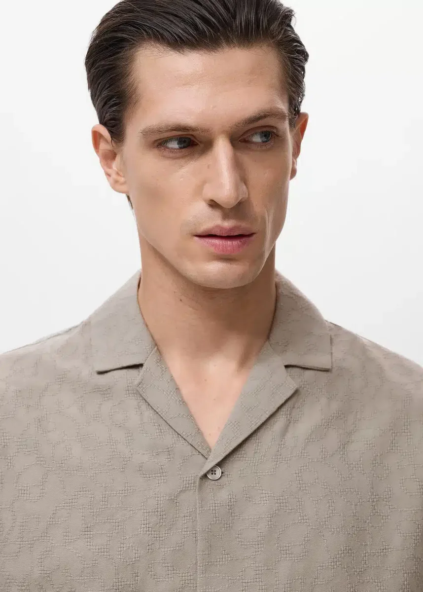 100% cotone. Silhouette regolare. Tessuto con struttura ricamata. Colletto bowling. Maniche corte. Chiusura frontale con bottoni. La modella è alta 170 cm e indossa una taglia M.