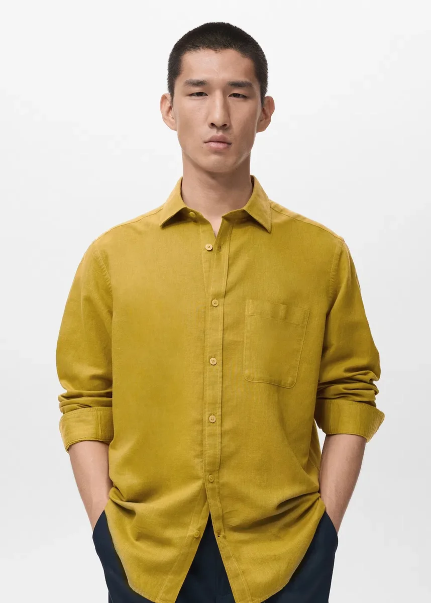 Vestibilità regolare. Tessuto misto lino e cotone. Taschino sul petto. Colletto camicia. Chiusura frontale con bottoni. Maniche lunghe con polsini abbottonati.