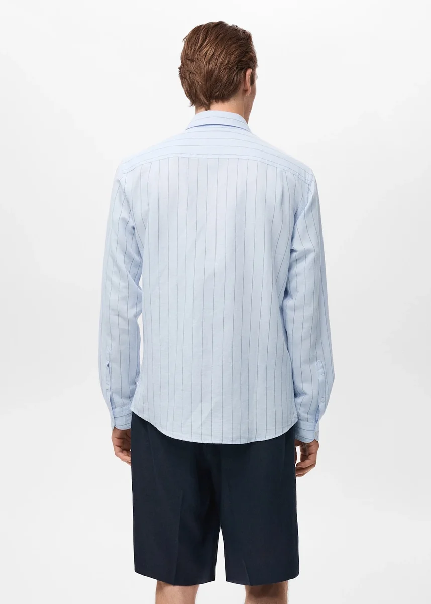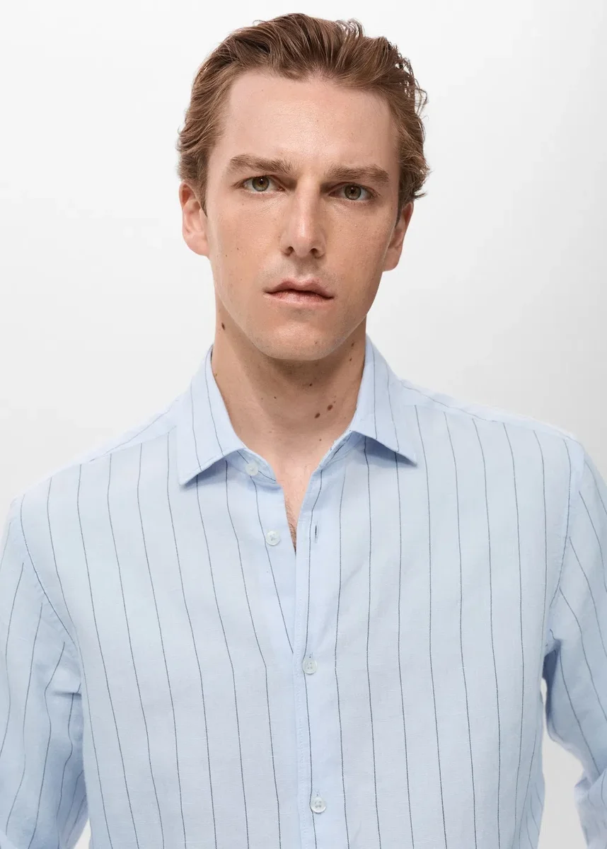 Vestibilità regolare. Tessuto con lino. Colletto camicia. Chiusura frontale con bottoni. Maniche lunghe con polsini abbottonati. Dettaglio pinces sul retro. Orlo arrotondato