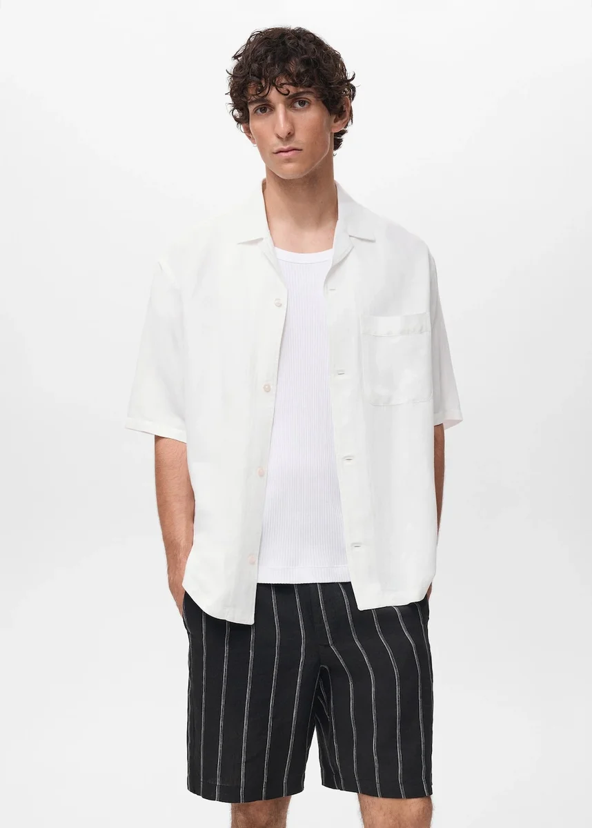 Vestibilità regolare. Tessuto misto lino. Tessuto cotone. Colletto bowling. Chiusura con bottoni sul davanti. Maniche corte. Tasca applicata sul petto. Orlo dritto.