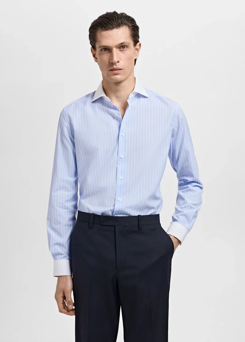 Vestibilità slim. 100% cotone. Stampa a righe. Collo alla coreana. Chiusura frontale con bottoni. Maniche lunghe con polsini abbottonati