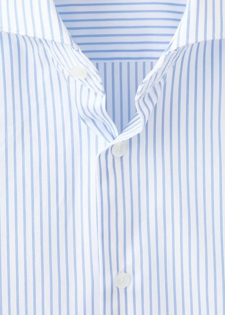 Vestibilità slim. Tessuto 100% cotone. Stampa a righe. Collo alla coreana. Maniche lunghe con polsini abbottonati. Chiusura frontale con bottoni