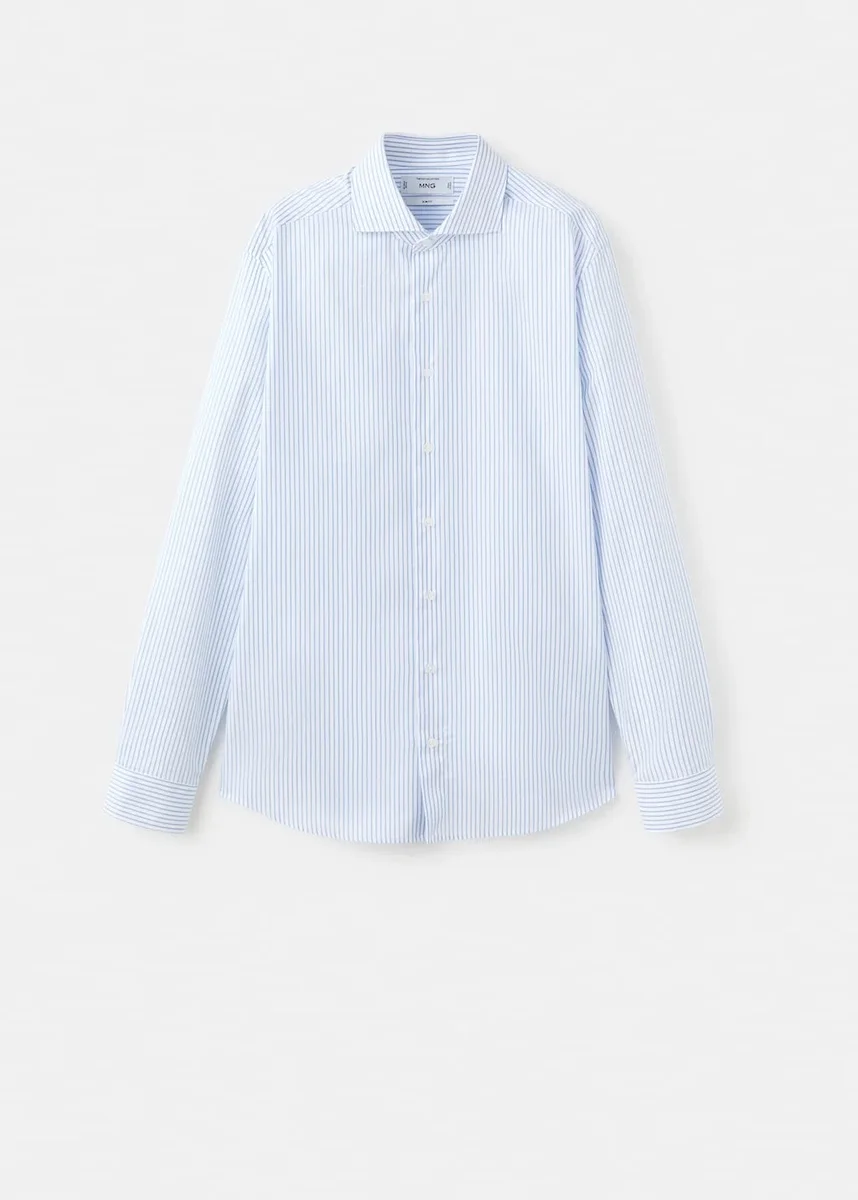 Vestibilità slim. Tessuto 100% cotone. Stampa a righe. Colletto aperto. Maniche lunghe con polsini abbottonati. Chiusura frontale con bottoni