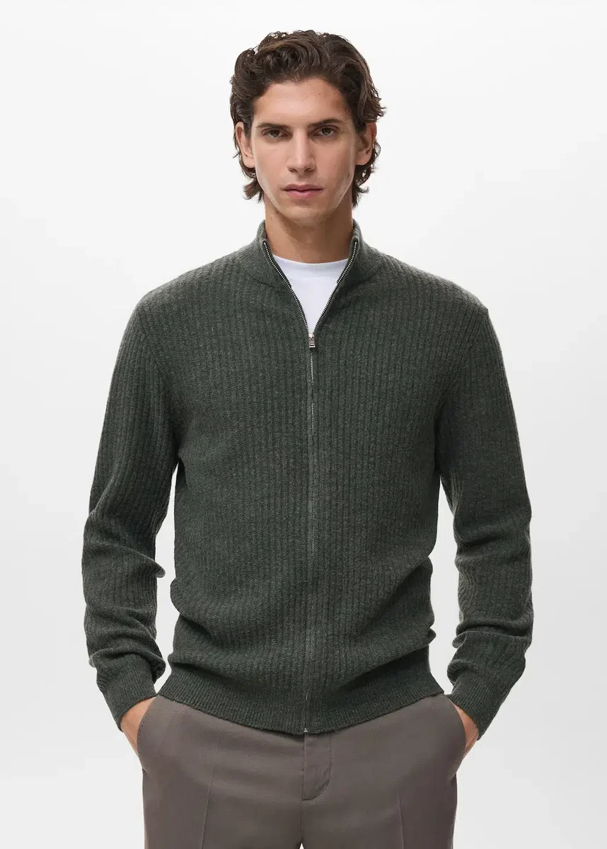 Silhouette dritta. Tessuto lavorato a maglia. Lavorazione a trecce. Collo alto. Maniche lunghe con polsini elasticizzati. Finiture a costine su maniche e orlo. Chiusura frontale con zip.