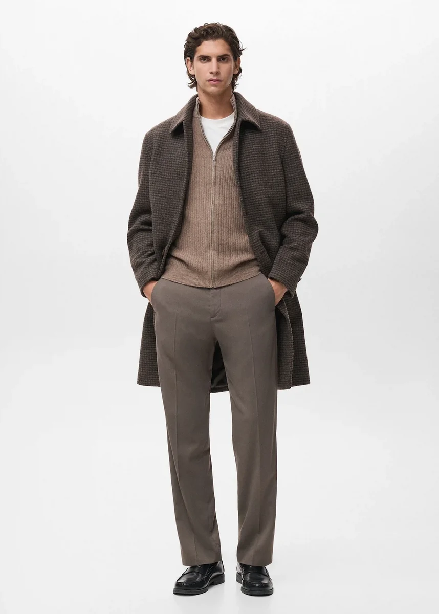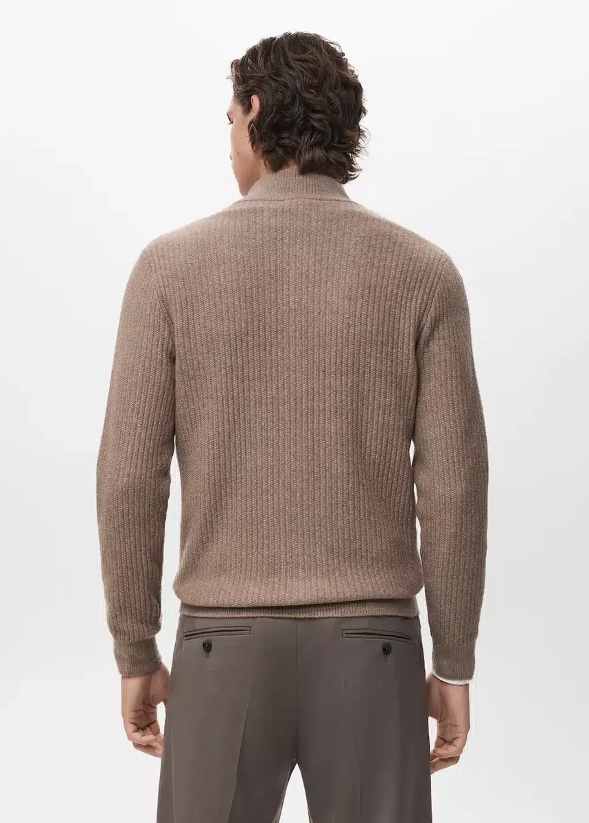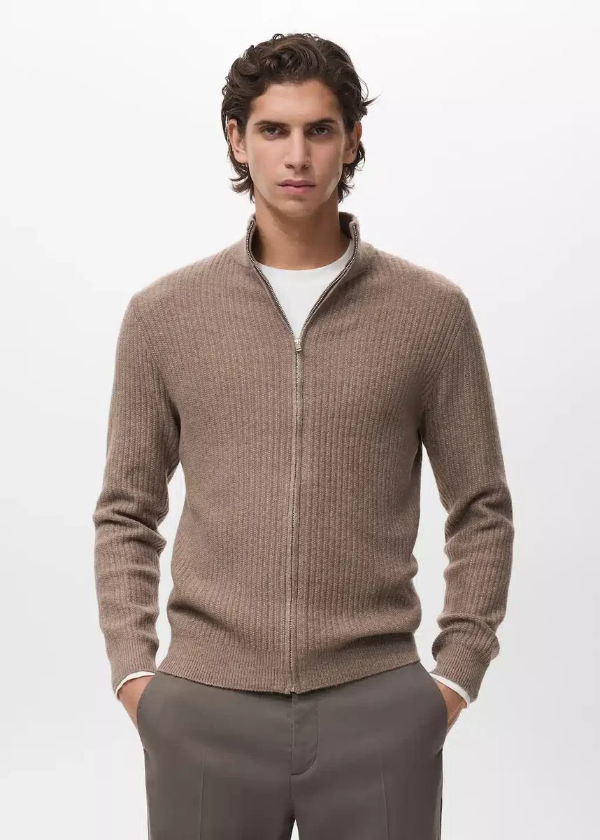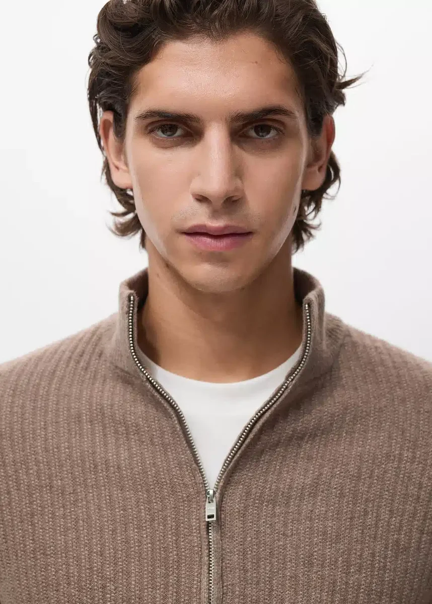 Silhouette dritta. Tessuto lavorato a maglia. Lavorazione a trecce. Collo alto. Maniche lunghe con polsini elasticizzati. Finiture a costine su maniche e orlo. Chiusura frontale con zip.