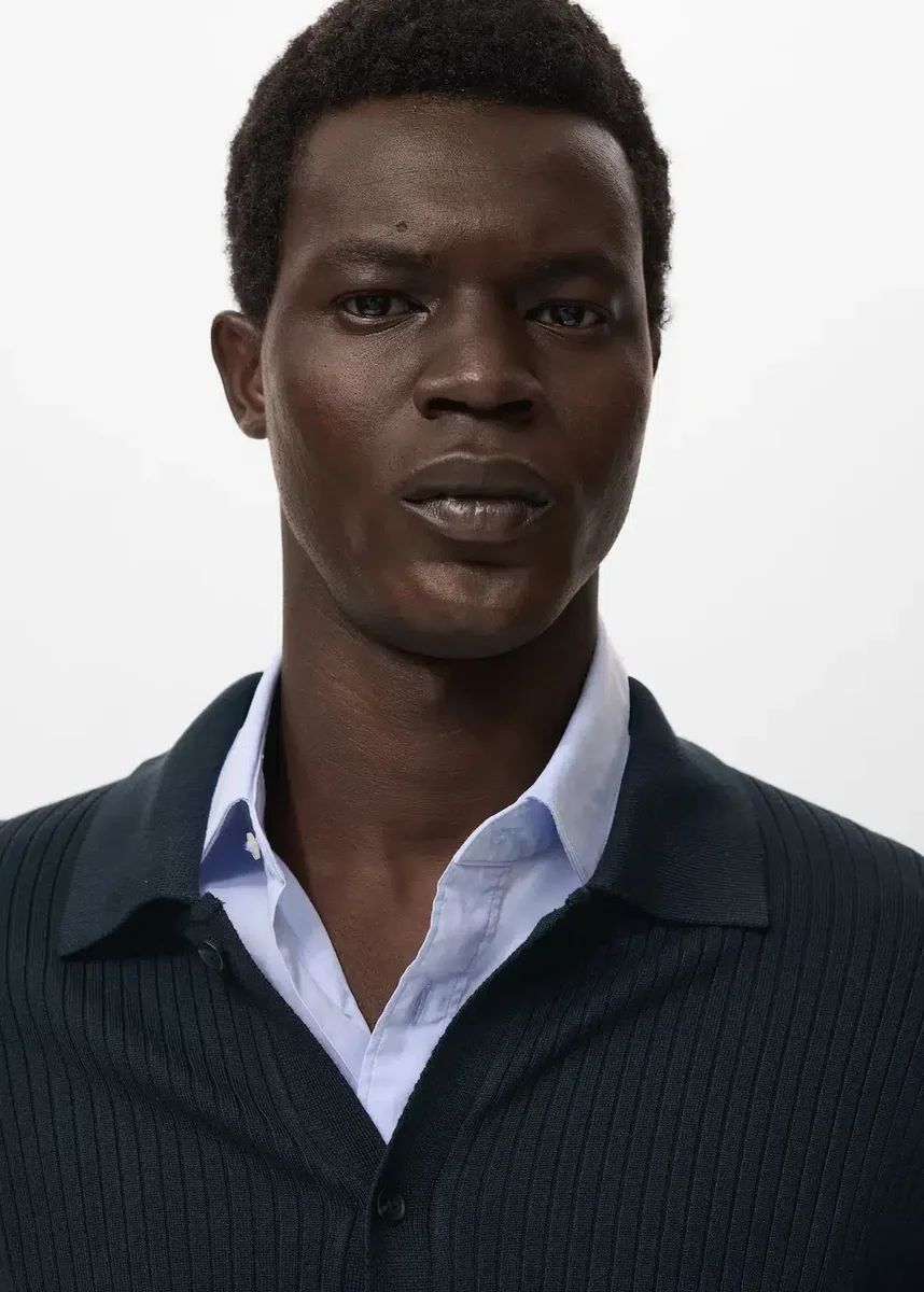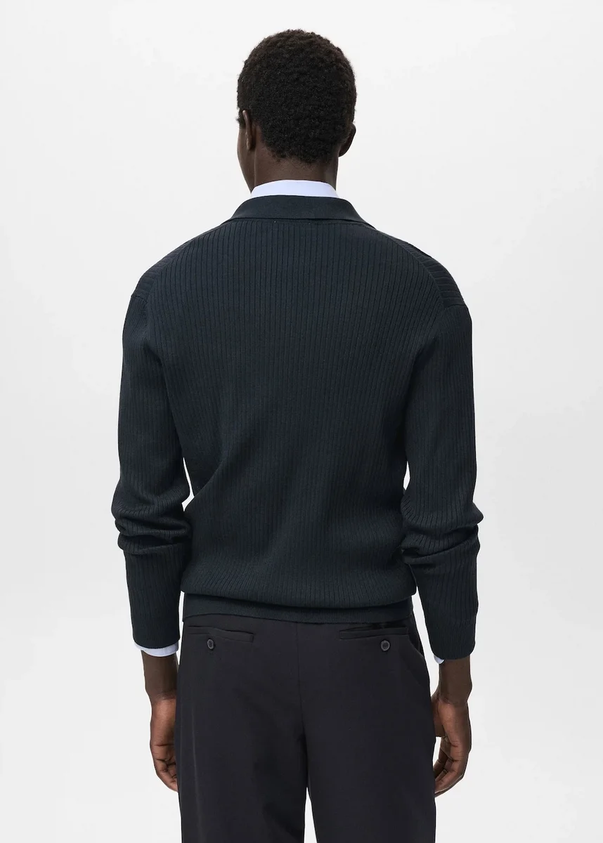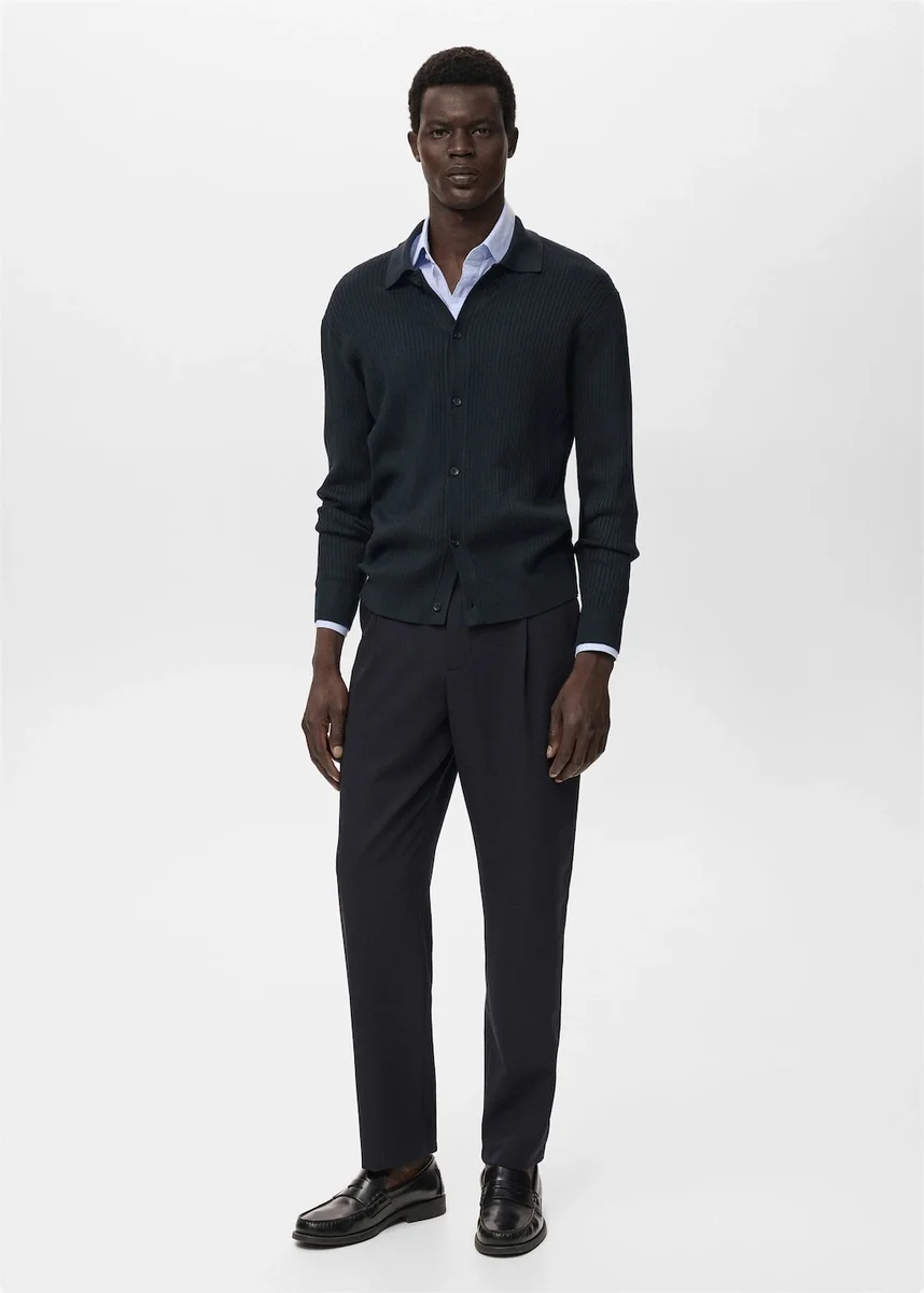 Silhouette dritta. Tessuto a maglia a coste. Collo camicia. Chiusura frontale con bottoni. Maniche lunghe. Collo, polsini e orlo a costine.