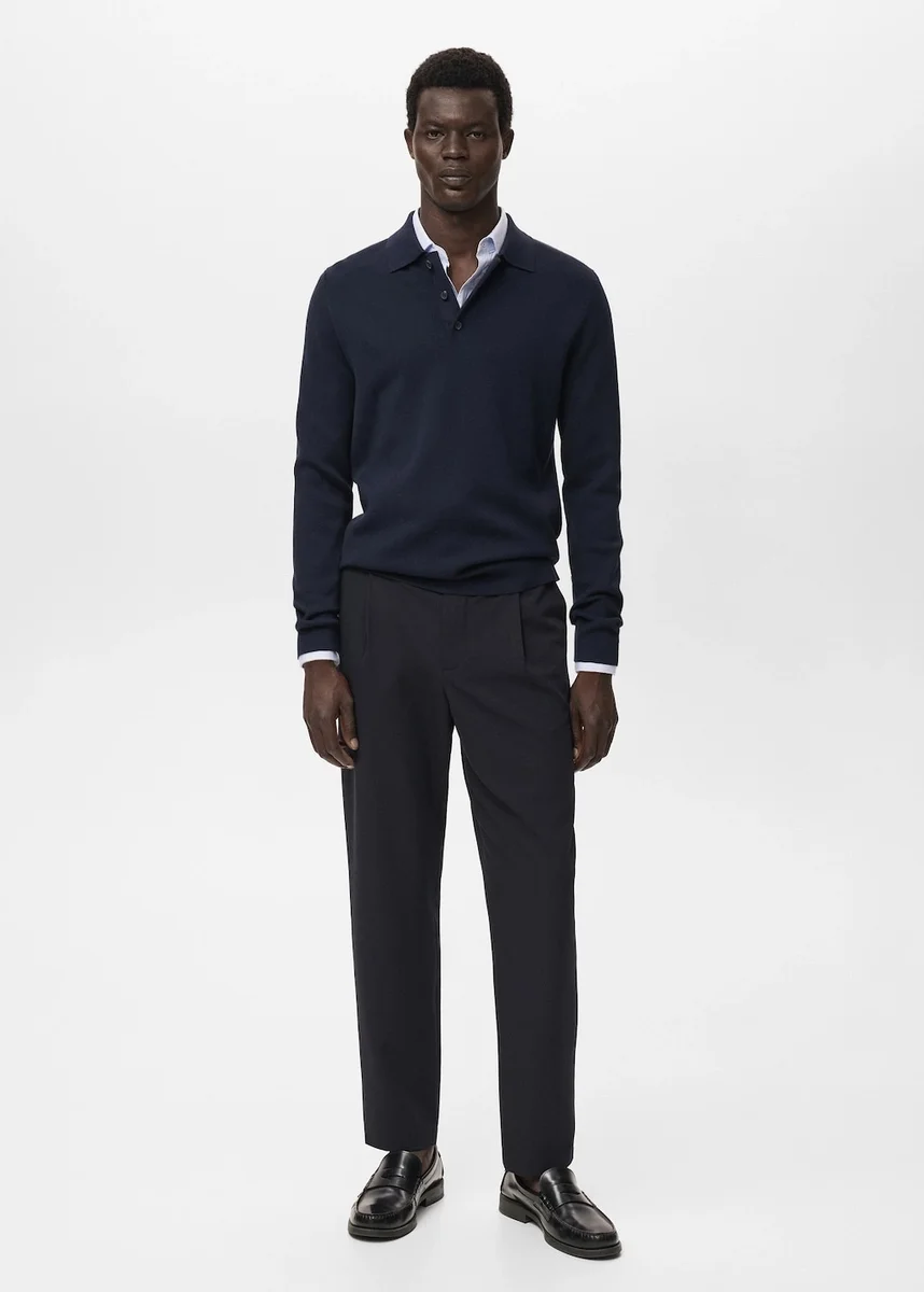 Modello dritto. Tessuto a maglia fine. Collo polo con chiusura a bottoni. Collo, maniche e orlo a costine. Maniche lunghe