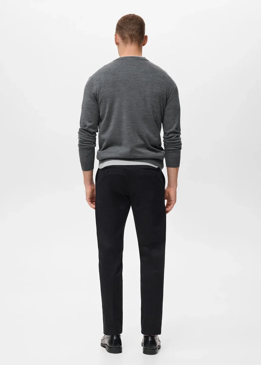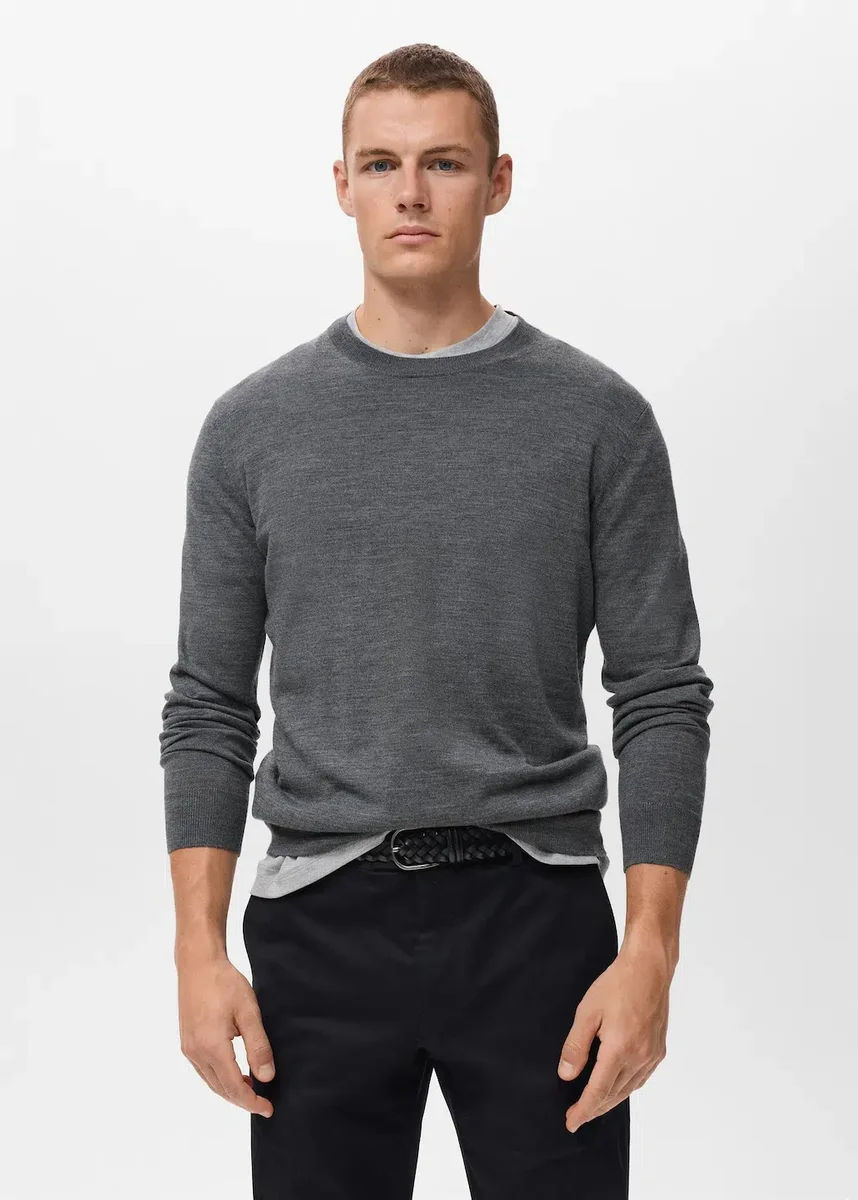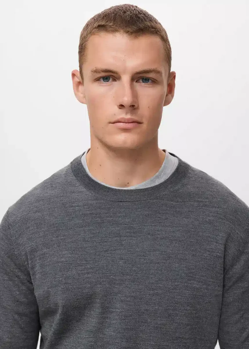 Vestibilità dritta. Tessuto 100% lana. Maglia fine. Girocollo. Maniche lunghe. Collo, maniche e orlo a costine.