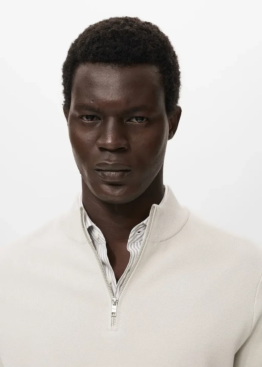 Tessuto a maglia fine. Vestibilità regolare. Collo Perkins con chiusura a zip. Collo, maniche e orlo a costine.