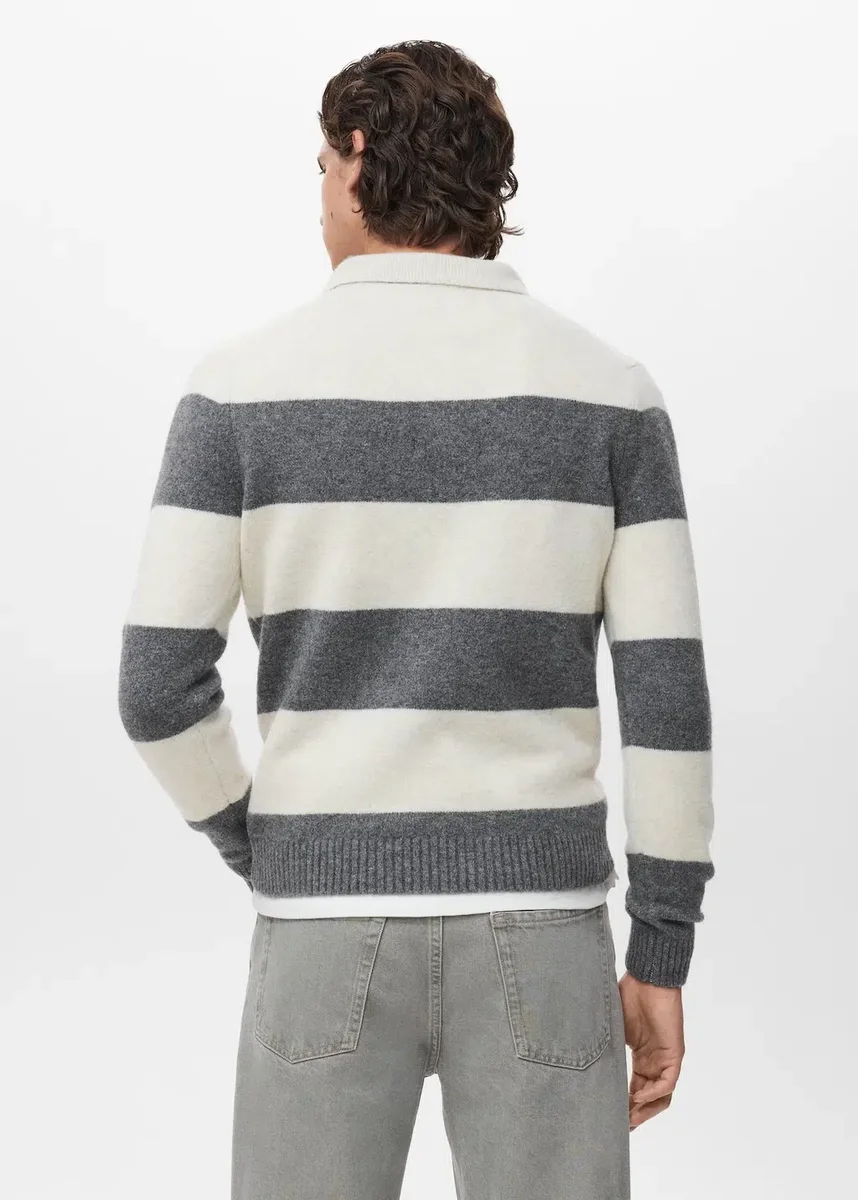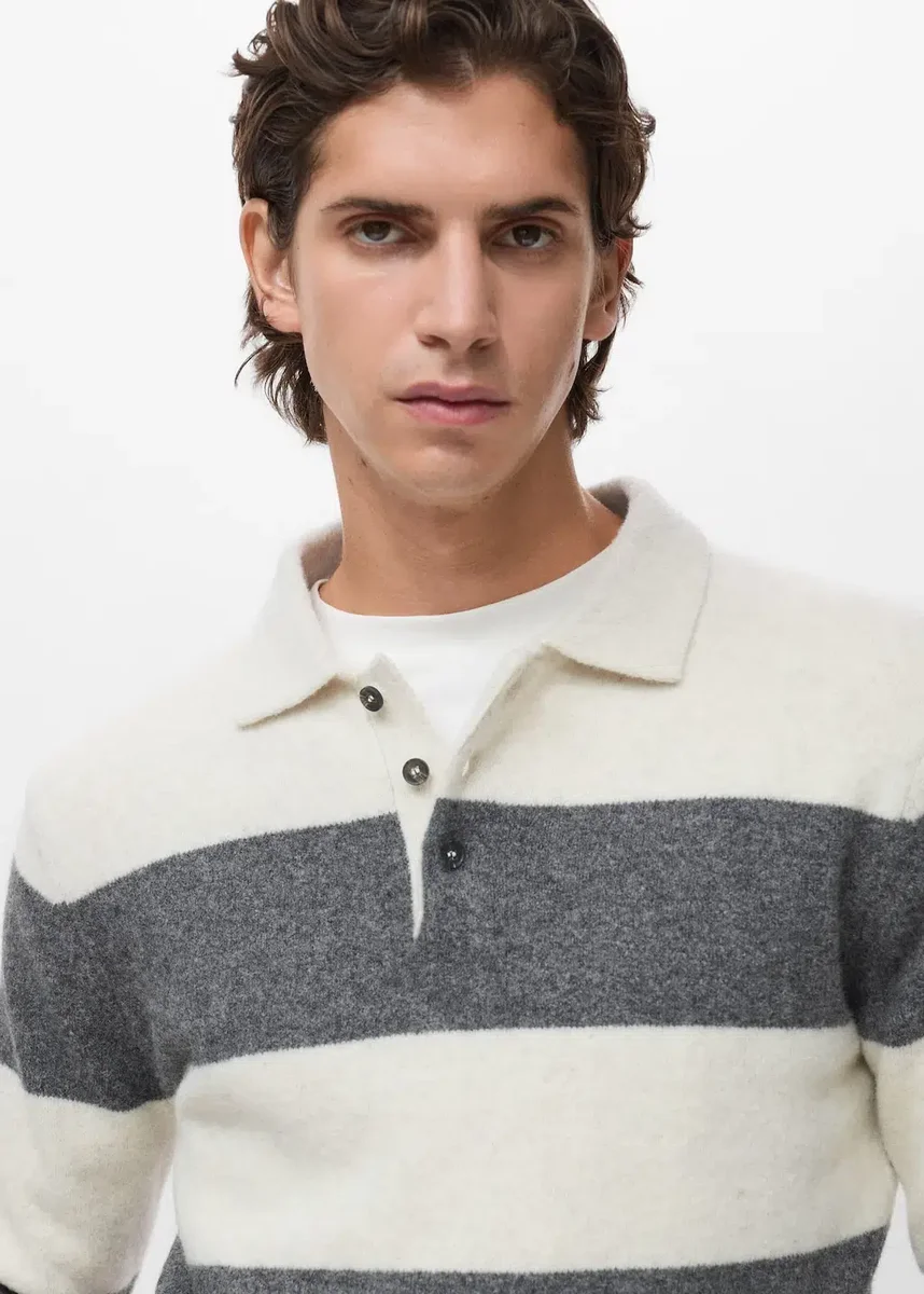 Tessuto misto lana. Design a righe. Silhouette dritta. Collo polo con chiusura a bottoni. Polsini a costine.