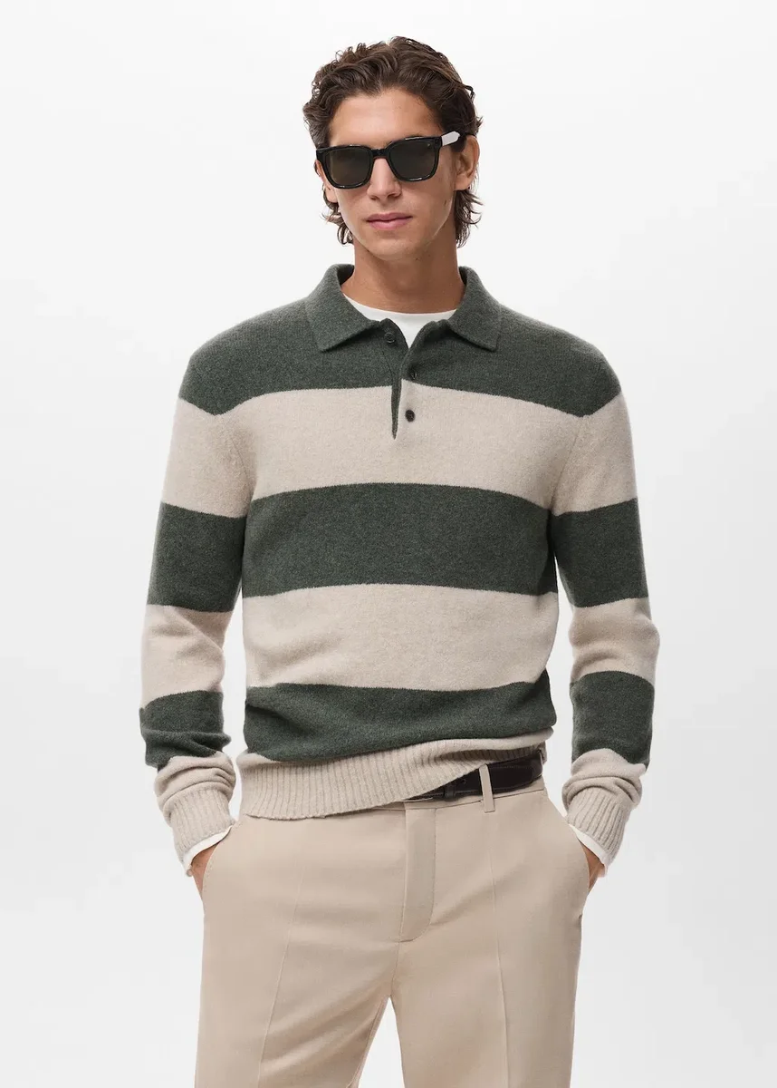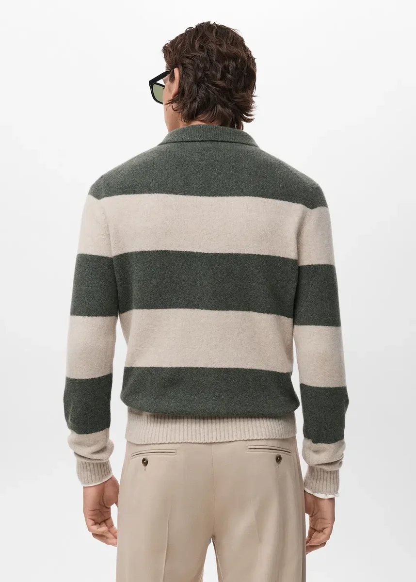 Tessuto misto lana. Design a righe. Silhouette dritta. Collo polo con chiusura a bottoni. Polsini a costine.