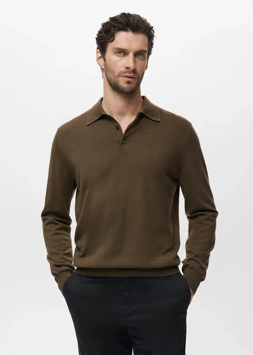 Vestibilità regolare. 100% lana merino. Maglia fine. Collo polo con chiusura a bottoni. Maniche lunghe. Maniche non rifinite. Polsini elasticizzati.
