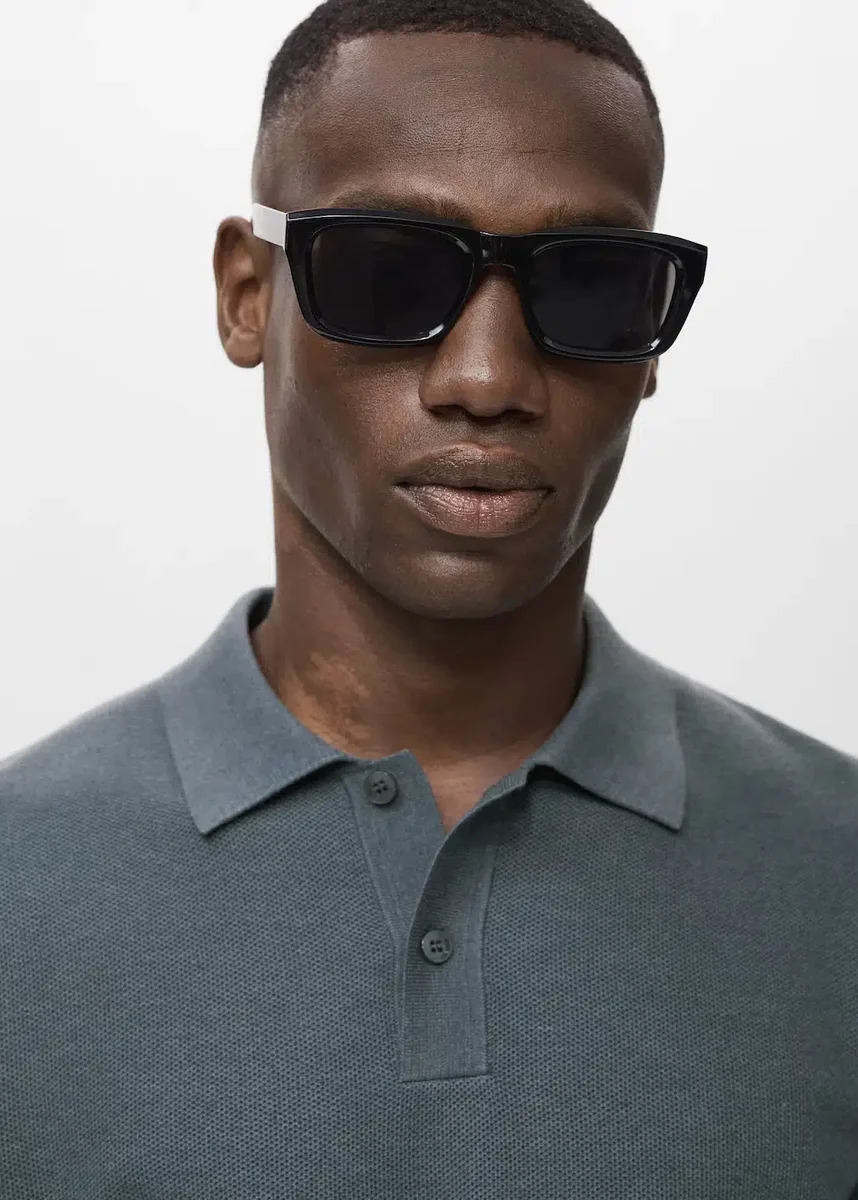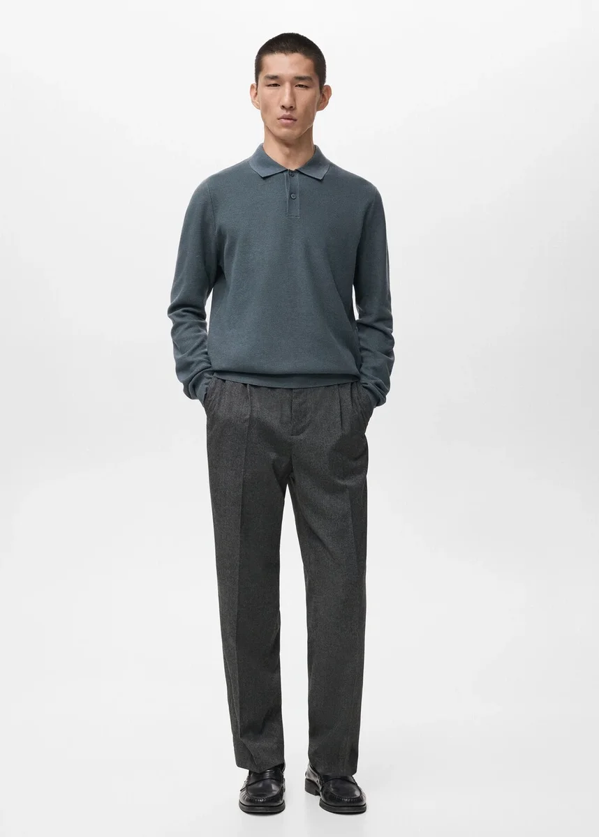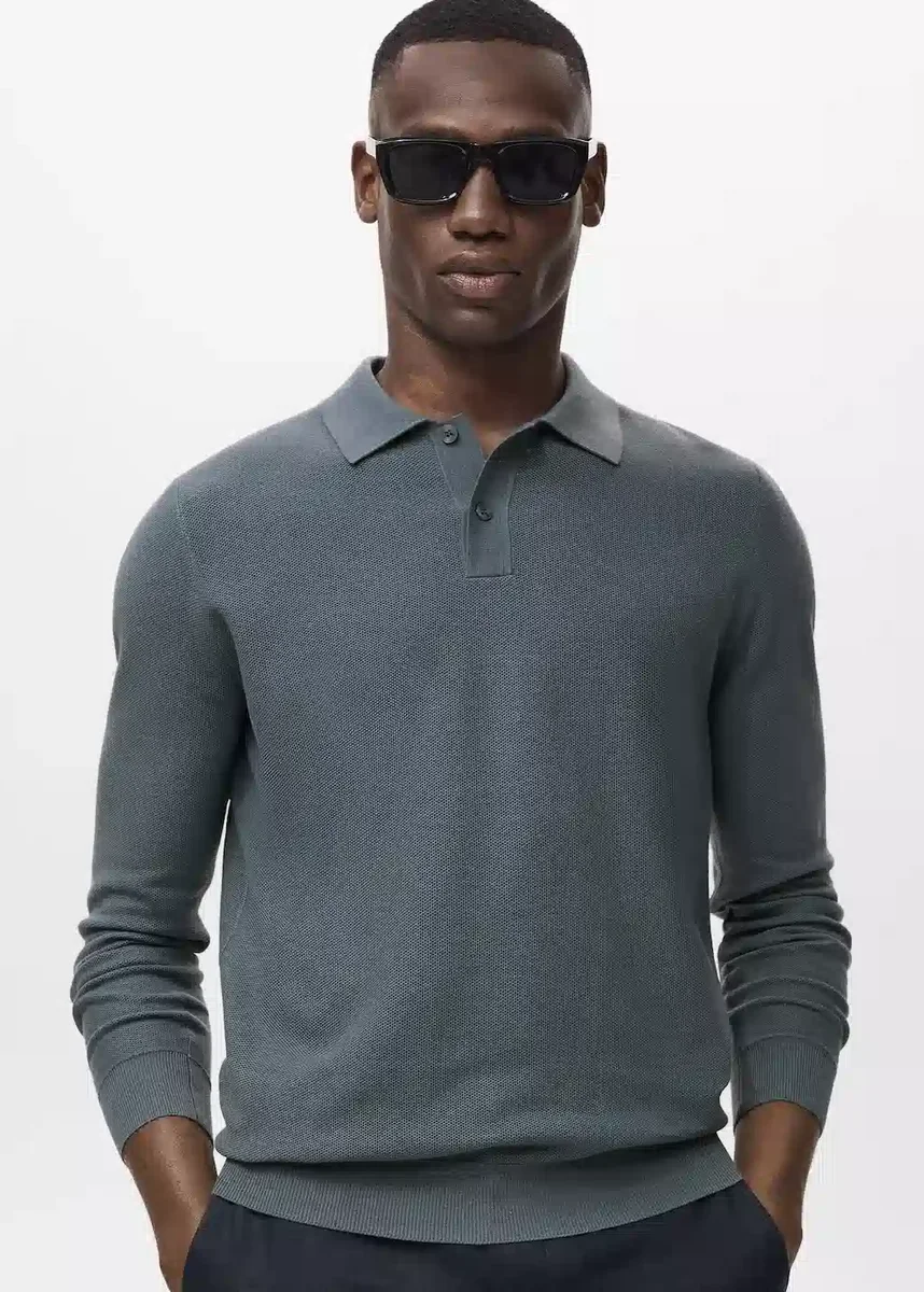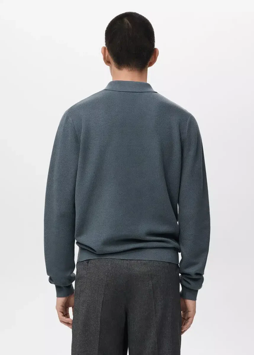 Silhouette dritta. Tessuto misto cotone. Tessuto a maglia fine con microstruttura. Collo polo. Maniche lunghe. Collo, maniche e orlo a costine