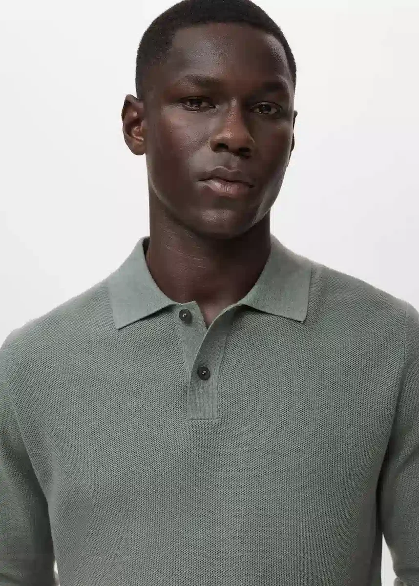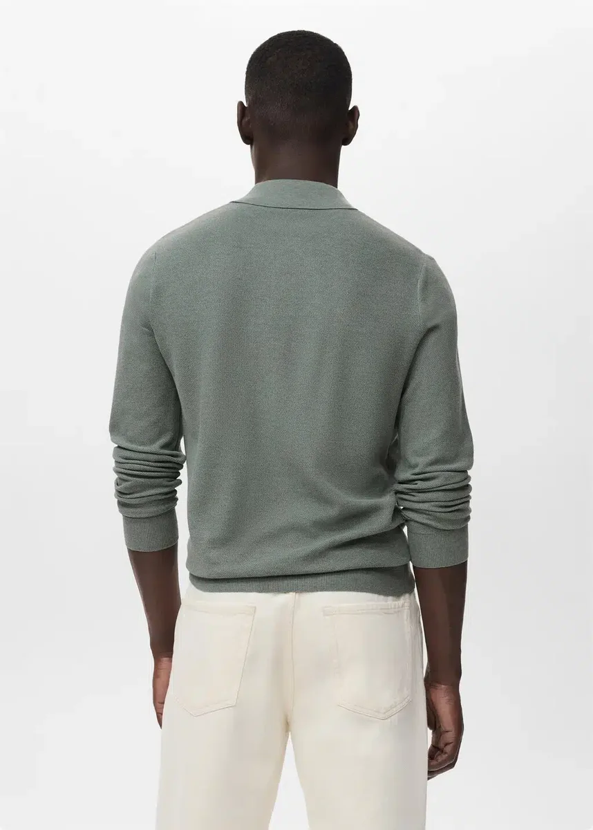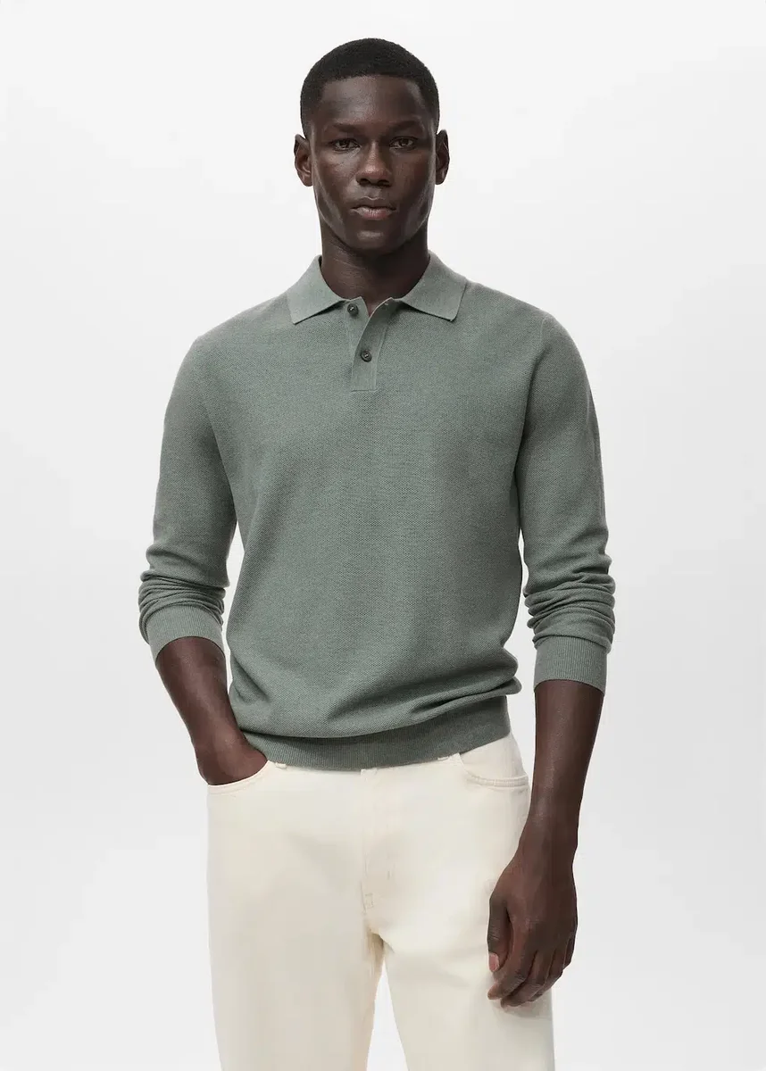 Silhouette dritta. Tessuto misto cotone. Tessuto a maglia fine con microstruttura. Collo polo. Maniche lunghe. Collo, maniche e orlo a costine