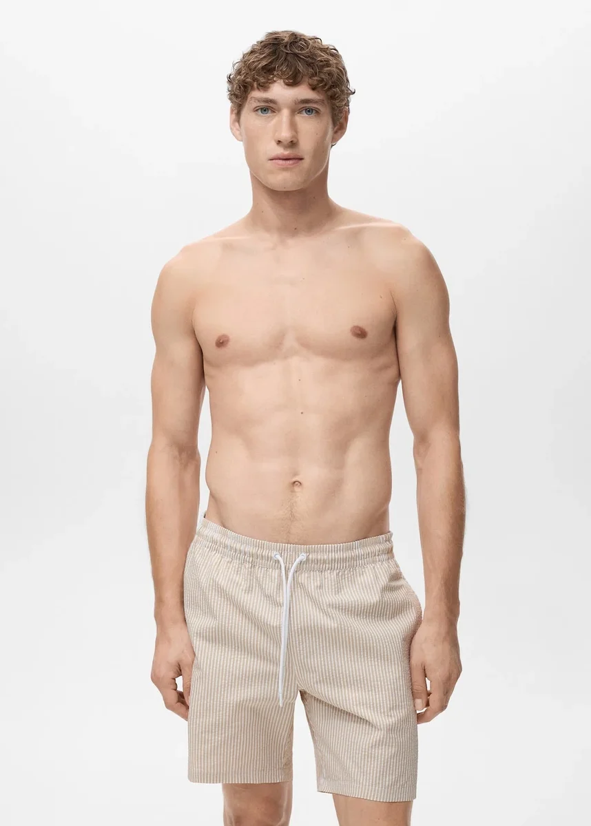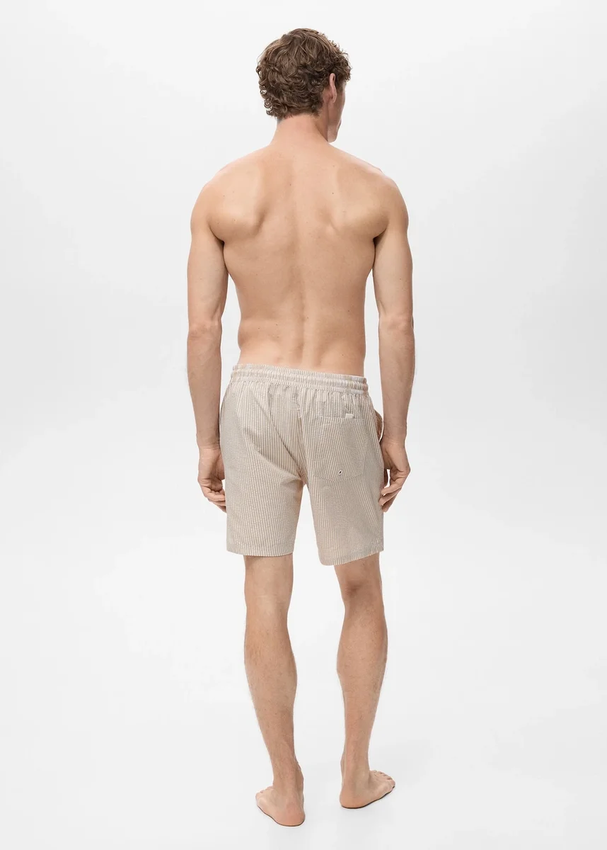 Tipo boxer. Tessuto misto cotone. Effetto seersucker. Elastico in vita con coulisse regolabile. Due tasche laterali. Tasca posteriore applicata con velcro. Piccoli spacchi laterali sull’orlo. Tessuto seersucker