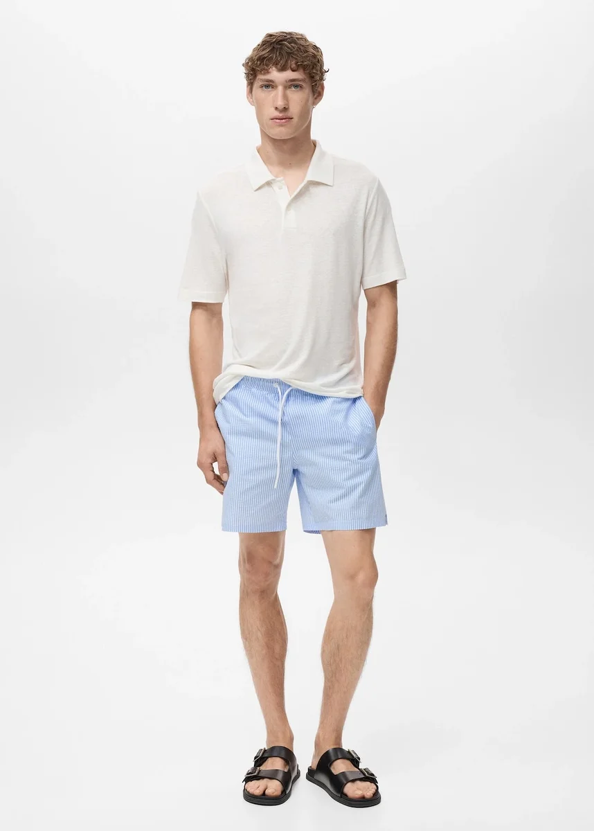 Tipo boxer. Tessuto misto cotone. Effetto seersucker. Elastico in vita con coulisse regolabile. Due tasche laterali. Tasca posteriore applicata con velcro. Piccoli spacchi laterali sull’orlo. Tessuto seersucker