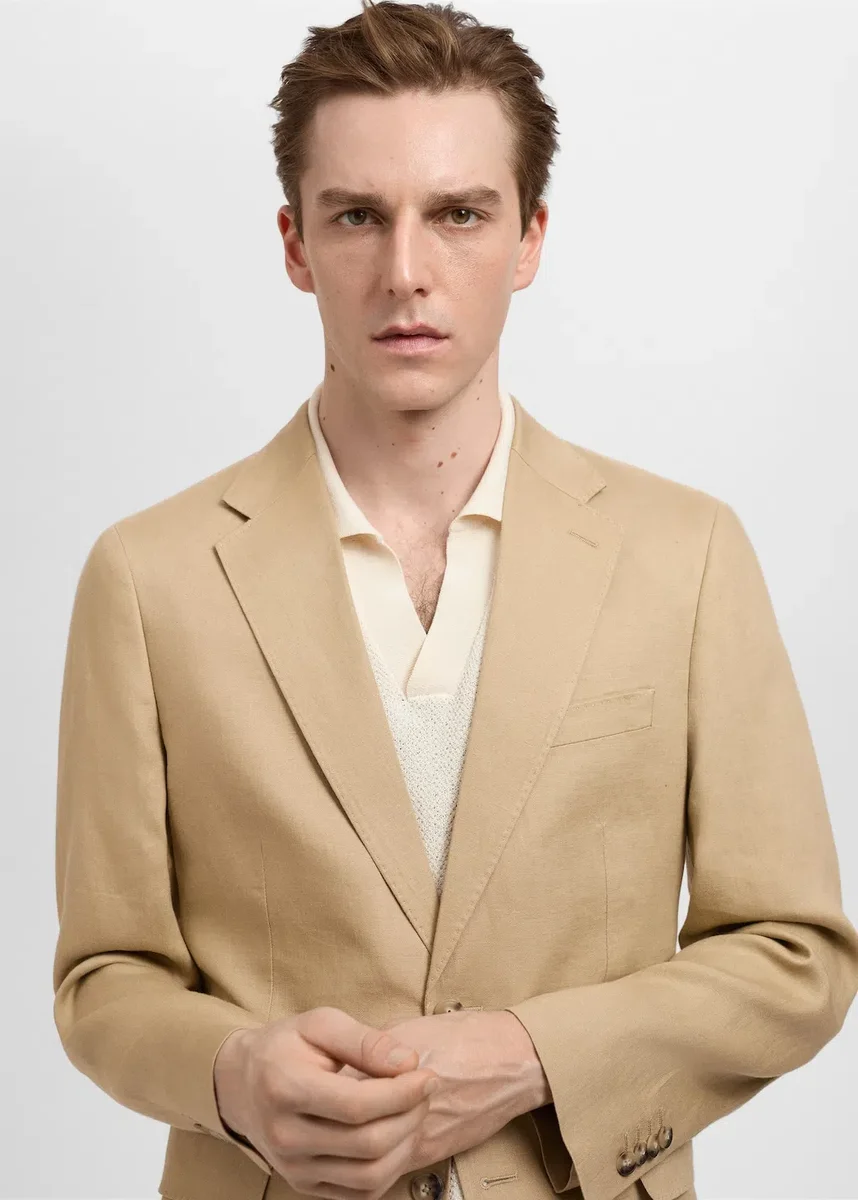 Vestibilità slim. Tessuto 100% lino. Collezione sartoriale. Revers classico e asola. Tasca a filetto sul petto. Due tasche con patta sul davanti. Maniche lunghe con polsini abbottonati. Due spacchi sul fondo posteriore. Fodera interna. Tasche interne. Prodotto promozionale.