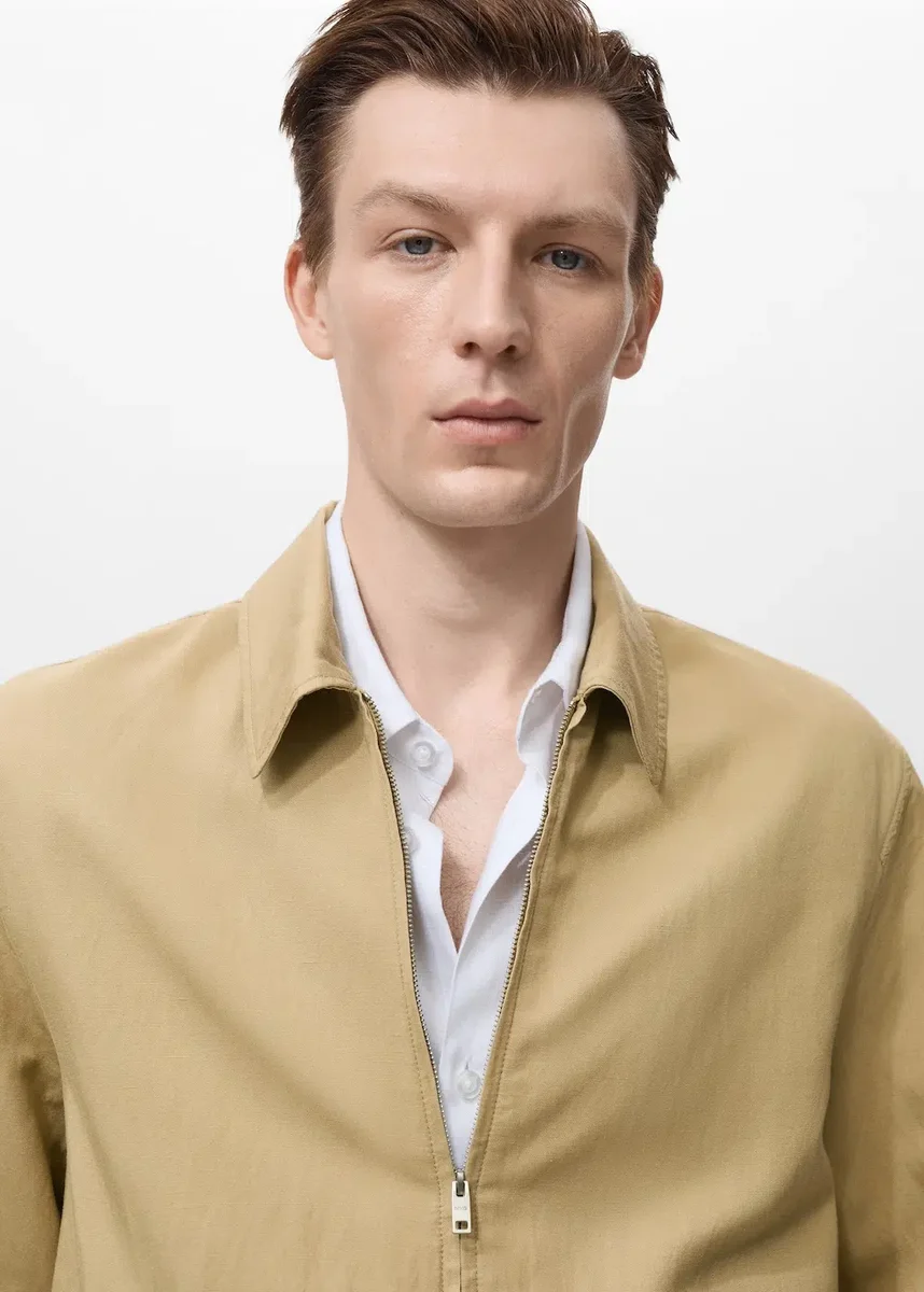 Silhouette dritta. Tessuto in viscosa, lino e cotone. Colletto camicia. Chiusura frontale con zip. Due tasche a filetto con bottone. Orlo con elastico