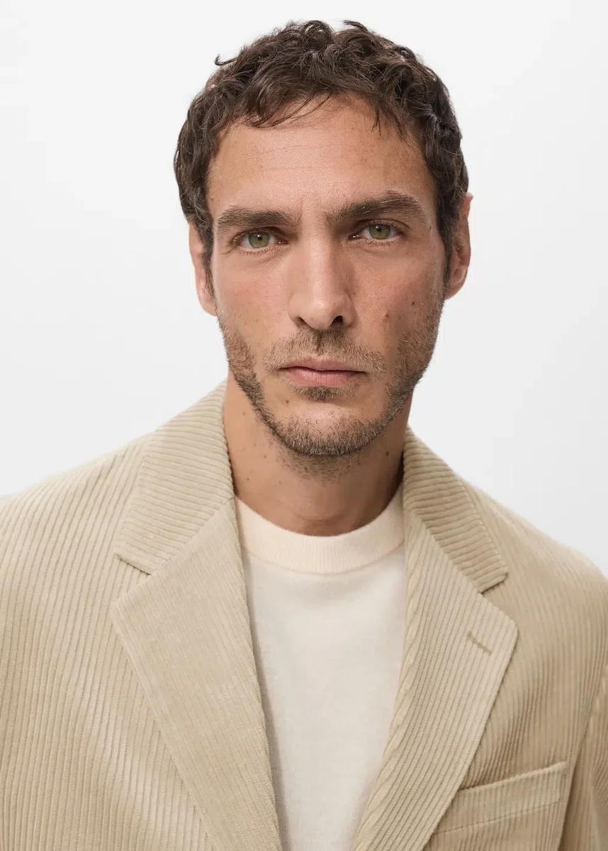 Vestibilità slim. Tessuto 100% cotone. Materiale: velluto a coste. Revers classico e asola. Tasca a filetto sul petto. Tasca interna. Due tasche laterali con patta. Maniche lunghe con polsini con striscia abbottonata. Fodera interna. Doppio spacco posteriore sull’orlo. Chiusura frontale con bottoni.