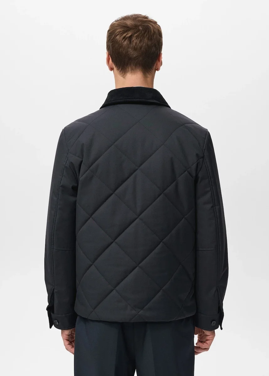 Vestibilità regolare. Idrorepellente: tessuto tecnico idrorepellente. Design trapuntato con struttura a rombi. Collo in velluto a coste. Tasca interna. Due tasche con patta e bottone sul davanti. Maniche lunghe con polsini abbottonati. Chiusura frontale con cerniera