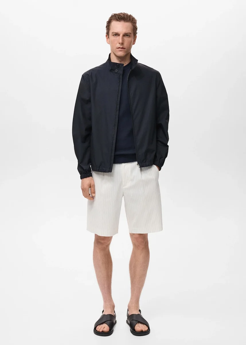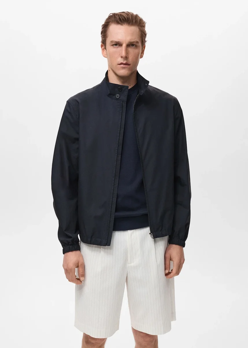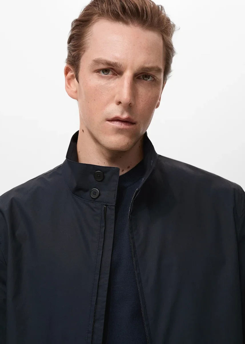 Tessuto 100% cotone. Vestibilità regolare. Colletto con bottoni. Due tasche laterali a filetto. Maniche lunghe con polsini elasticizzati. Chiusura frontale con zip. Tasca interna. Fodera interna. Orlo con elastico